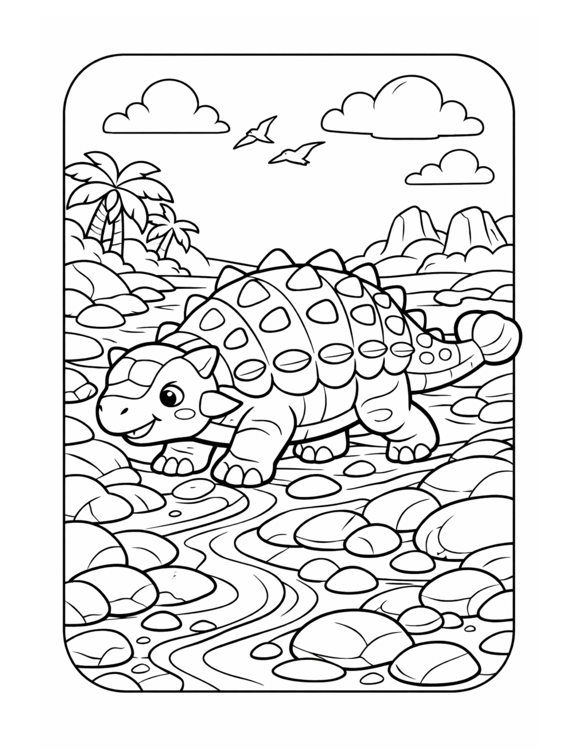 For this page, we entered the concept: “ankylosaurus walking in rocky river coloring page” on Colorin AI (enlazar “Colorin AI” a la pagina web https://www.colorin.ai/ y en negritas) and generated a print ready coloring page in seconds.