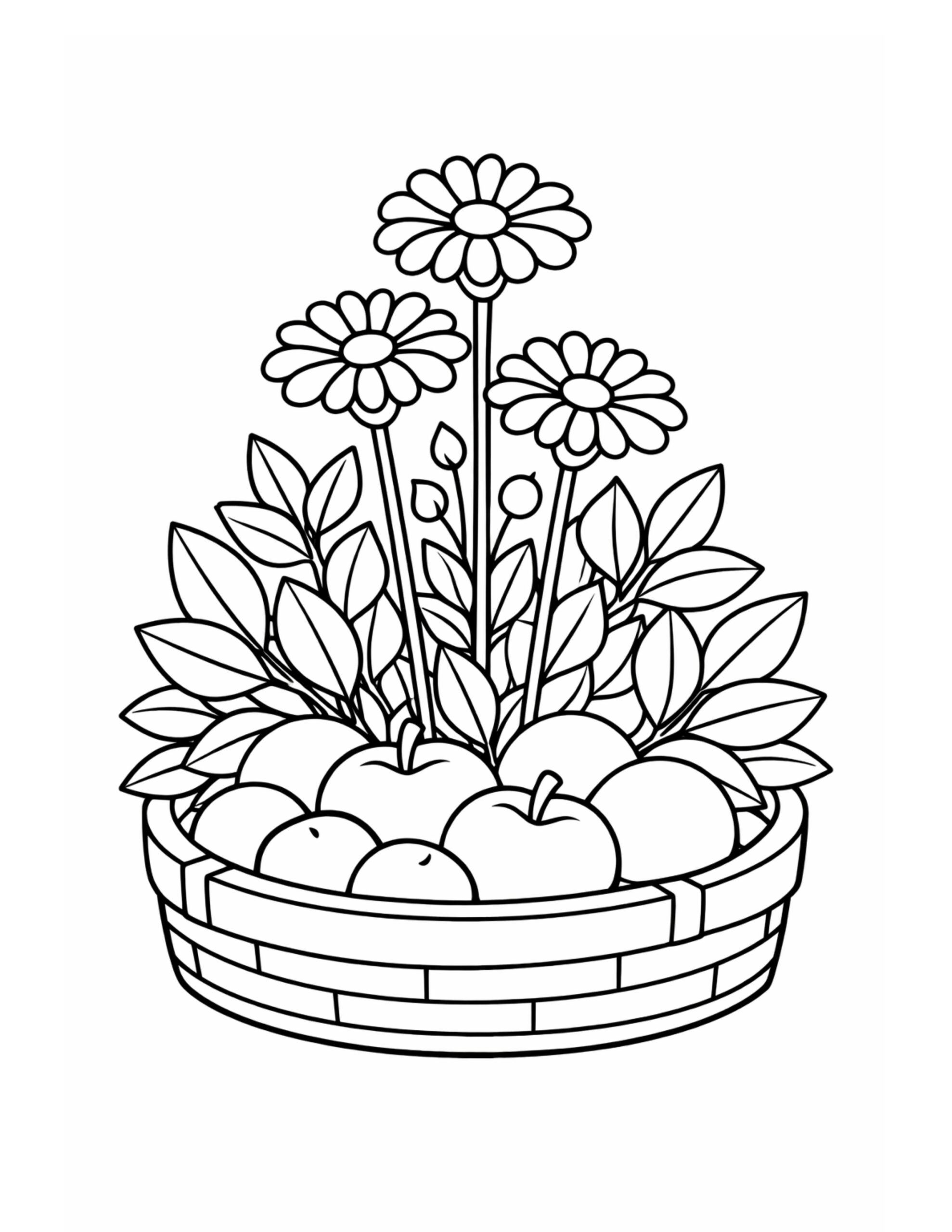 To start, try classic orchard reds, soft greens, or warm yellows on the fruit so the basket feels abundant and bright. Next, layer two greens on the leaves, using a darker shade near the stems and a lighter shade on the tips for a natural gradient. Also, the daisy petals look lovely in white, pale peach, or light lavender, while the centers can glow in sunny gold. Then, color the basket in tan or honey brown and add gentle shading between the bands to show depth. Finally, use a light gray or soft beige shadow under the basket to ground the still life without crowding the clean background.