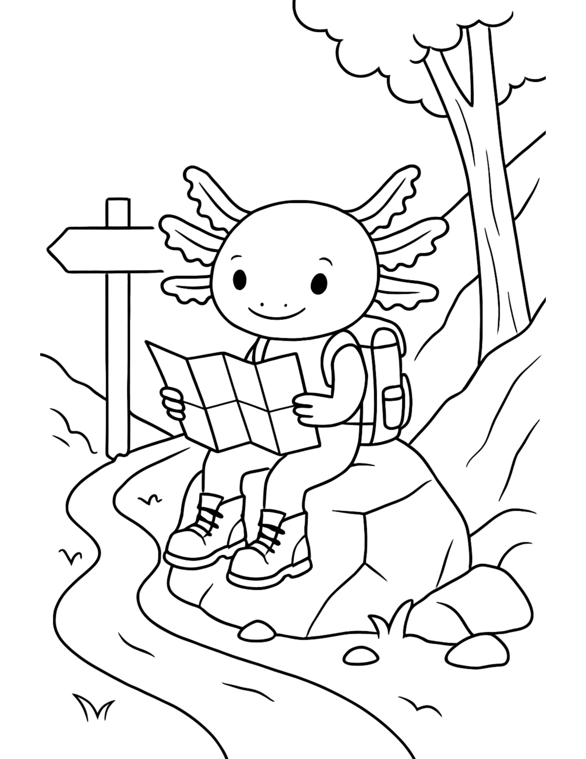 Meanwhile, axolotl reading a trail map coloring page shows a happy little hiker taking a break on a big rock. Nearby, a winding path and a simple signpost suggest a fun route to follow. Plus, the backpack and boots make it extra playful to color.