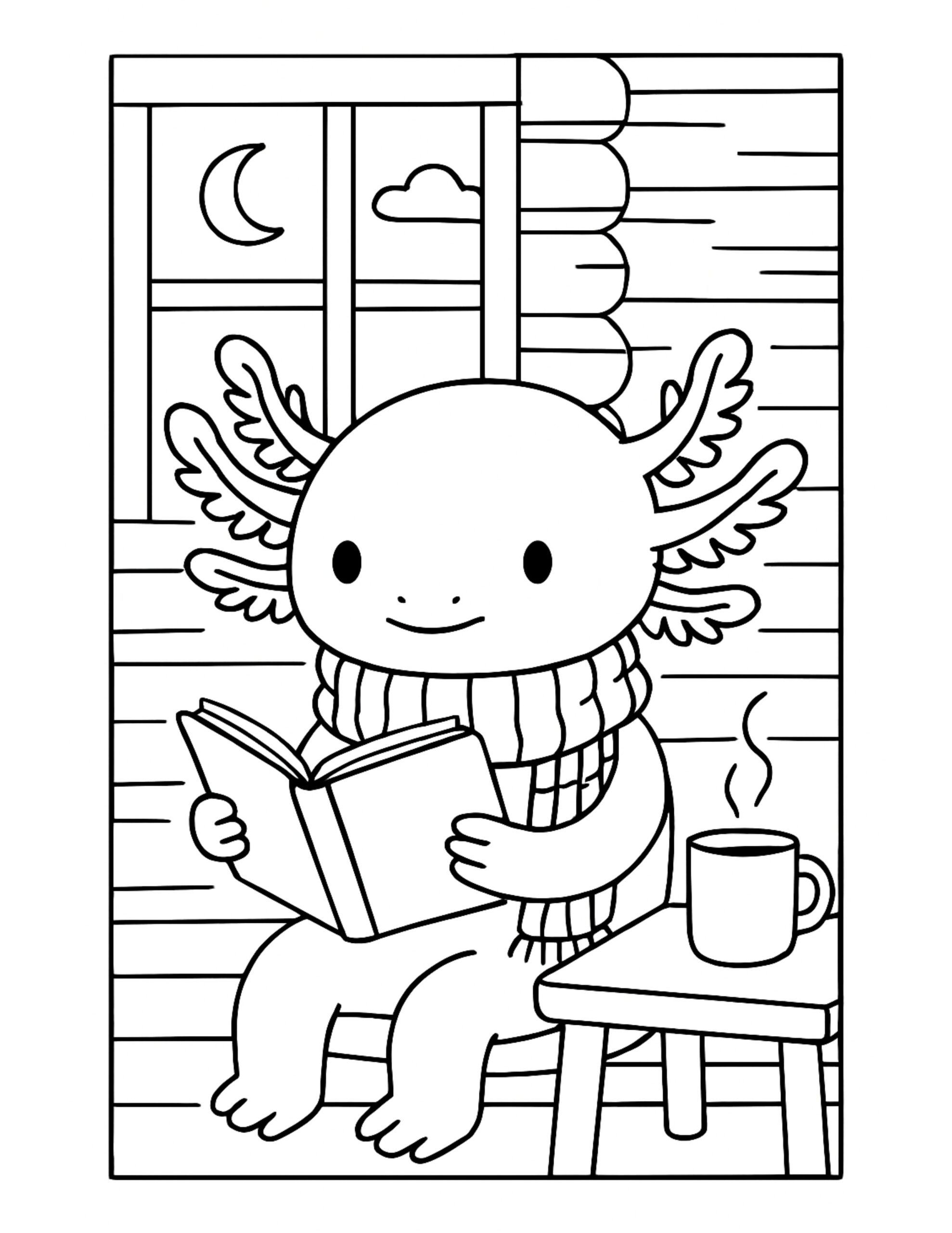 Axolotl Reading by Moonlit Window Coloring Page