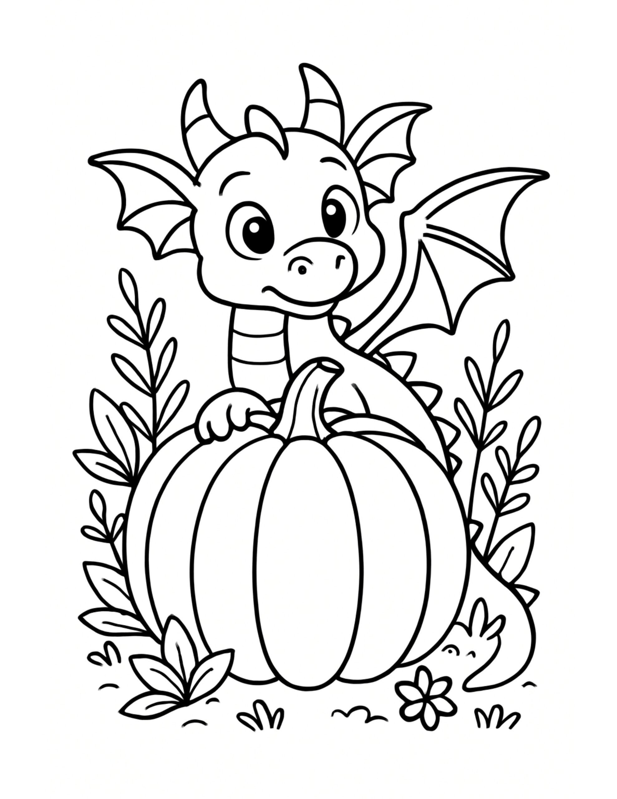 Baby Dragon Hugging a Pumpkin Coloring Page