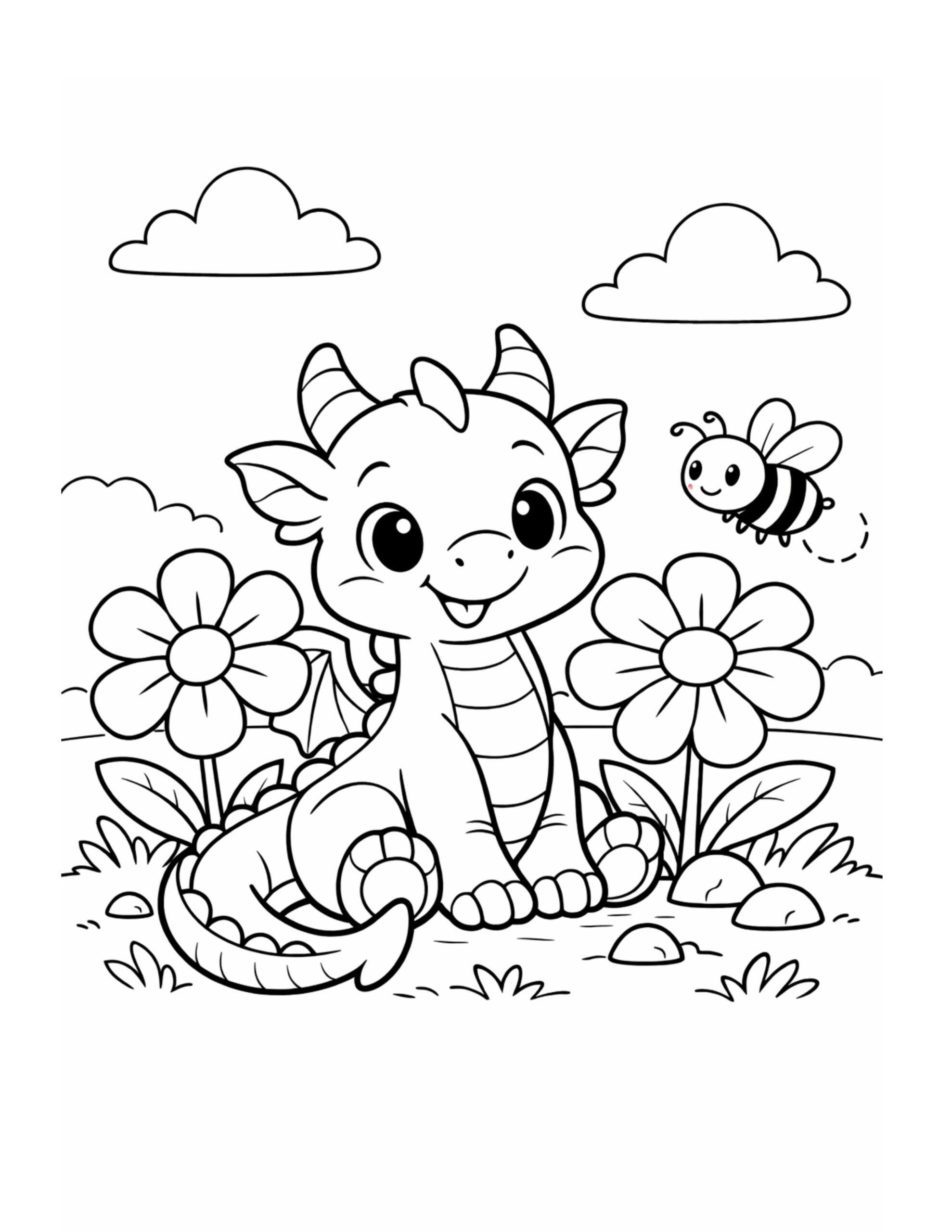 For this page, we entered the concept: “baby dragon with a bee coloring page with a cute dragon sitting between large flowers while a small bee flies in the sky” on Colorin AI and generated a print ready coloring page in seconds.