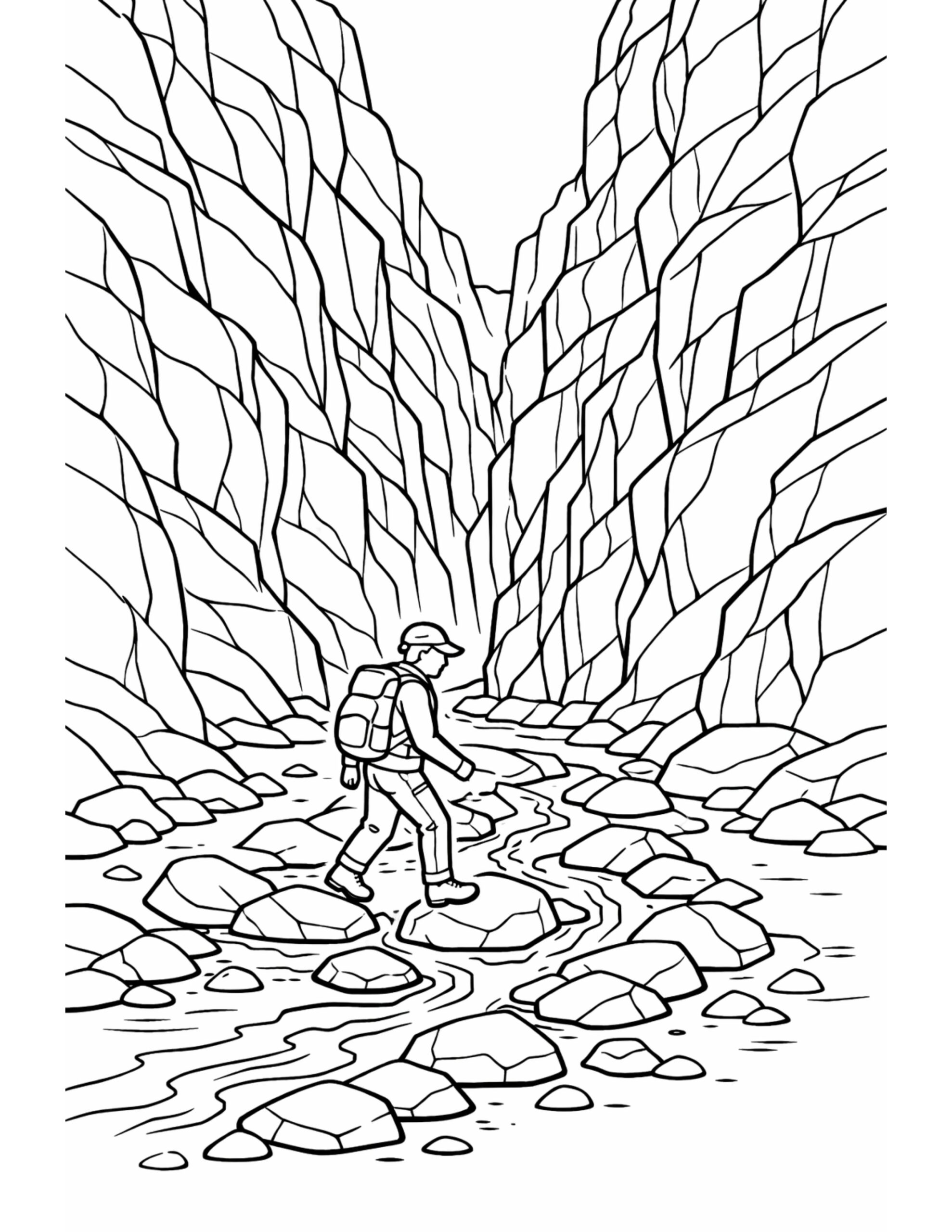 Backpacker Crossing Rocky Canyon Stream Coloring Page
