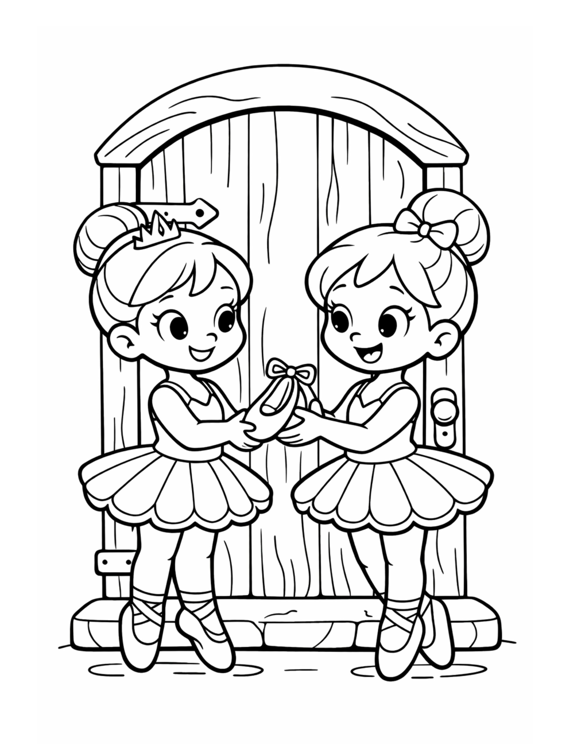 In this ballerina duo sharing a shoe coloring page, two smiling dancers stand in front of a wooden door and hold a ballet slipper together. Meanwhile, one wears a tiny crown and the other has a cute hair bow, so the moment feels friendly and sweet. Overall, the clear lines and big shapes make it a relaxing page that still looks detailed when finished.
