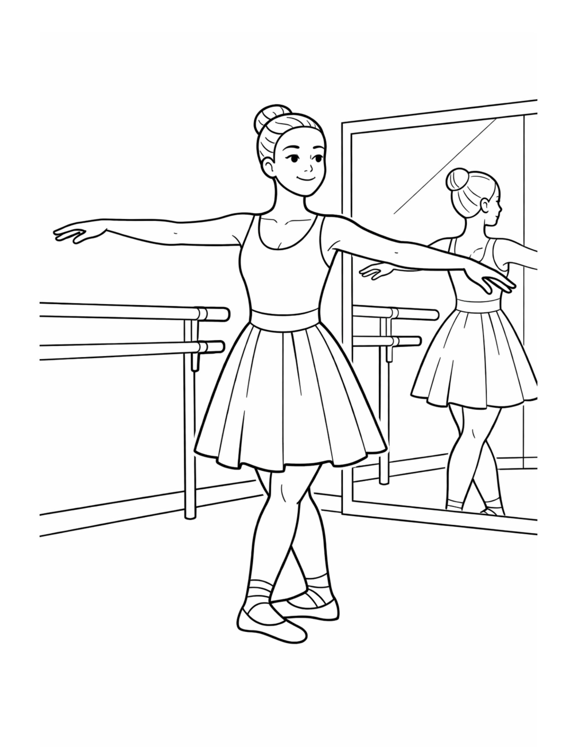 Ballerina Stretching at the Barre in Front of a Mirror Coloring Page