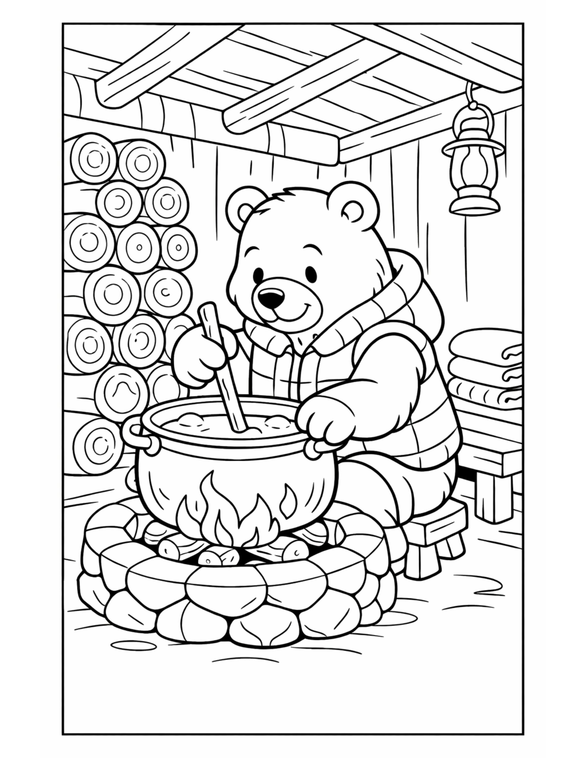 Bear Cooking Soup Over Fire Coloring Page