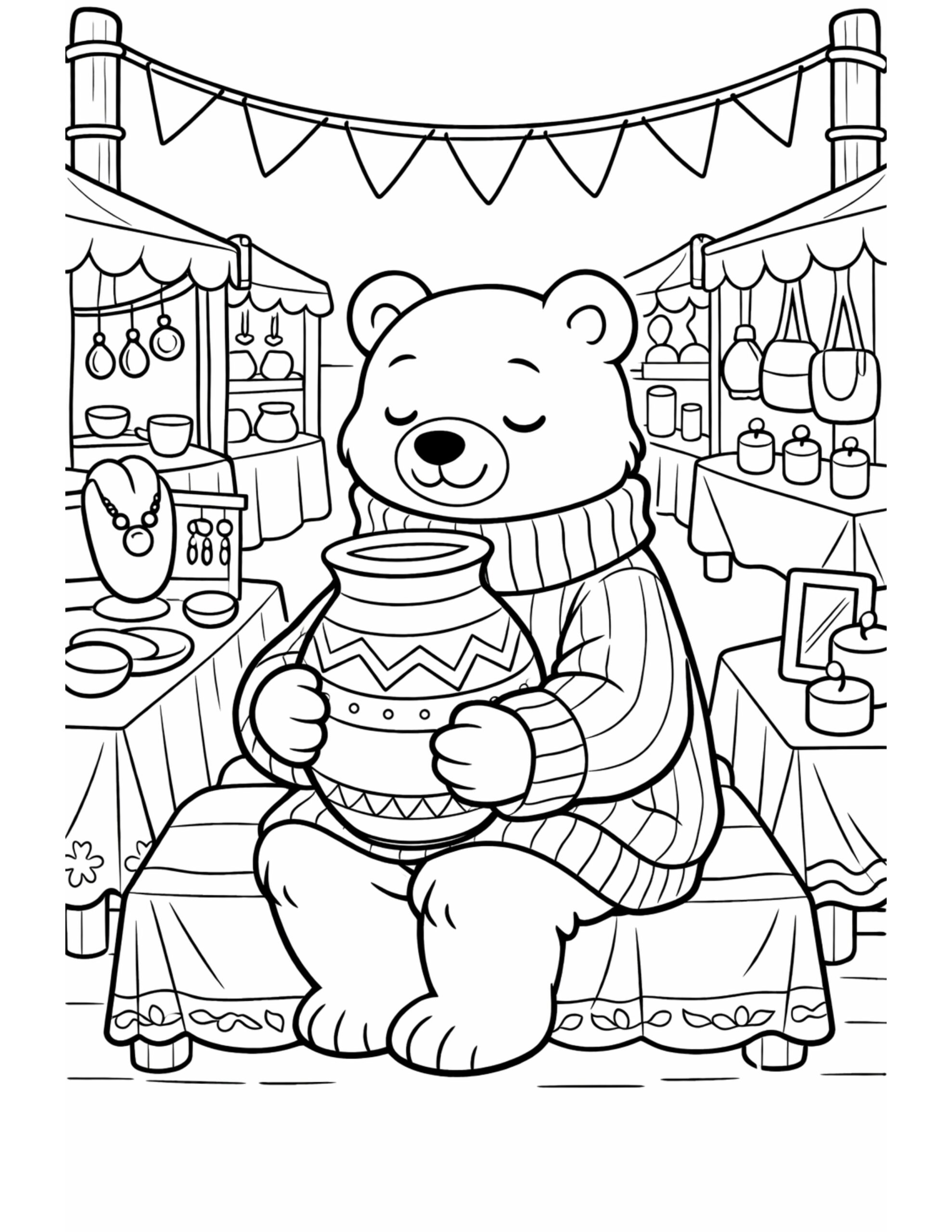 Most importantly, the calm market setting can feel relaxing and mindful. As you shade the bear, the pottery, and the background, you practice patience and focus in a warm, satisfying way.