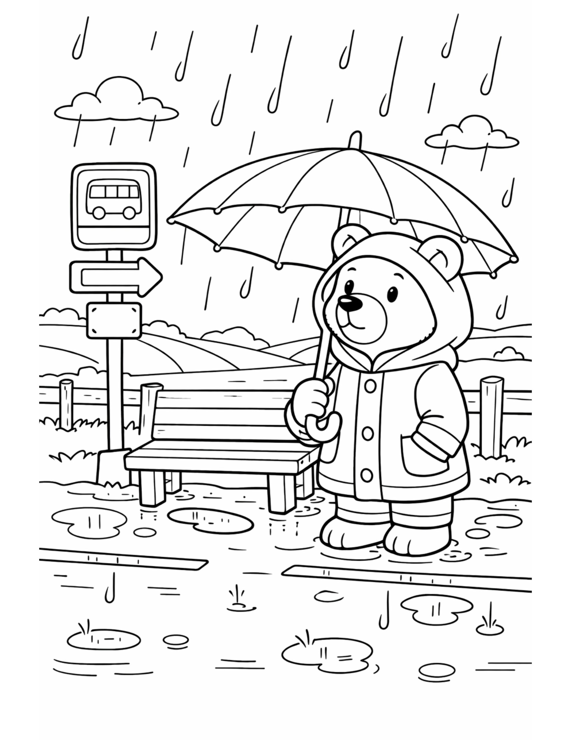 The bear waiting at bus stop coloring page shows a cute bear standing calmly under an umbrella while rain falls all around. Meanwhile, puddles form on the ground, a simple bench sits nearby, and soft clouds hang in the sky. Because the scene feels quiet and steady, it’s especially soothing to color at a relaxed pace.