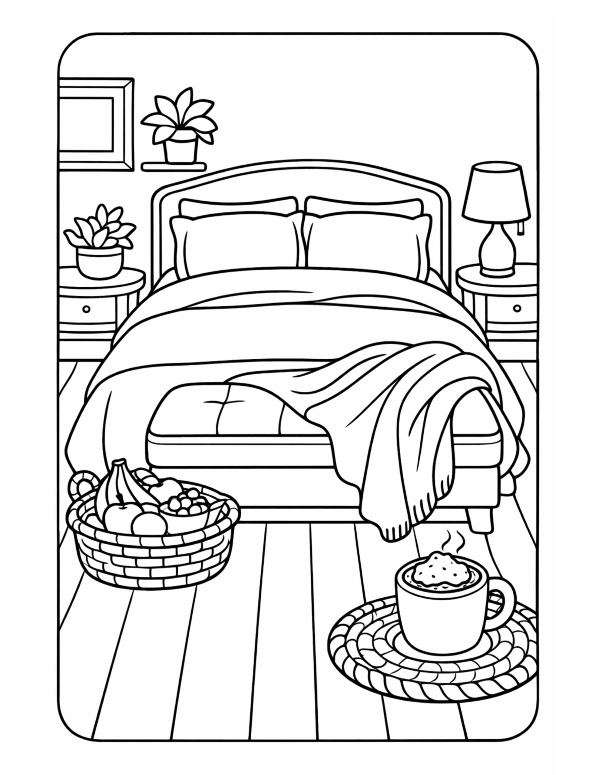 First, this bedroom hot cocoa by bed coloring page captures a calm bedroom scene with a neatly made bed and a blanket draped over the edge. Meanwhile, a cozy mug with steam sits on a woven mat in the foreground, adding a warm, relaxing touch. Overall, it’s satisfying to color because the room has big, peaceful shapes and a few charming details.