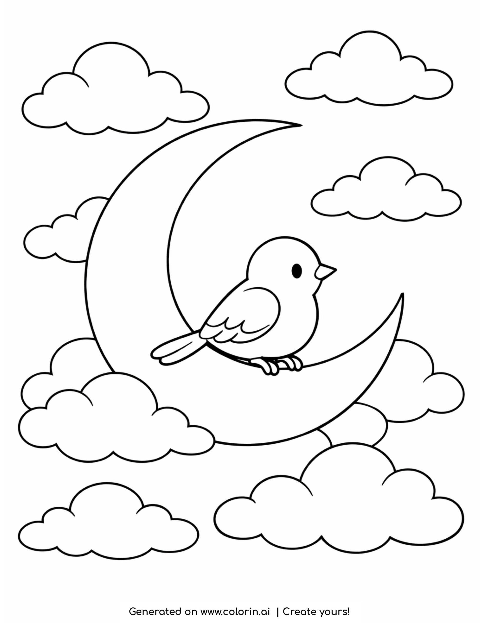 For this page, we entered the concept: bird on crescent moon coloring page on Colorin AI and generated a print ready coloring page in seconds.