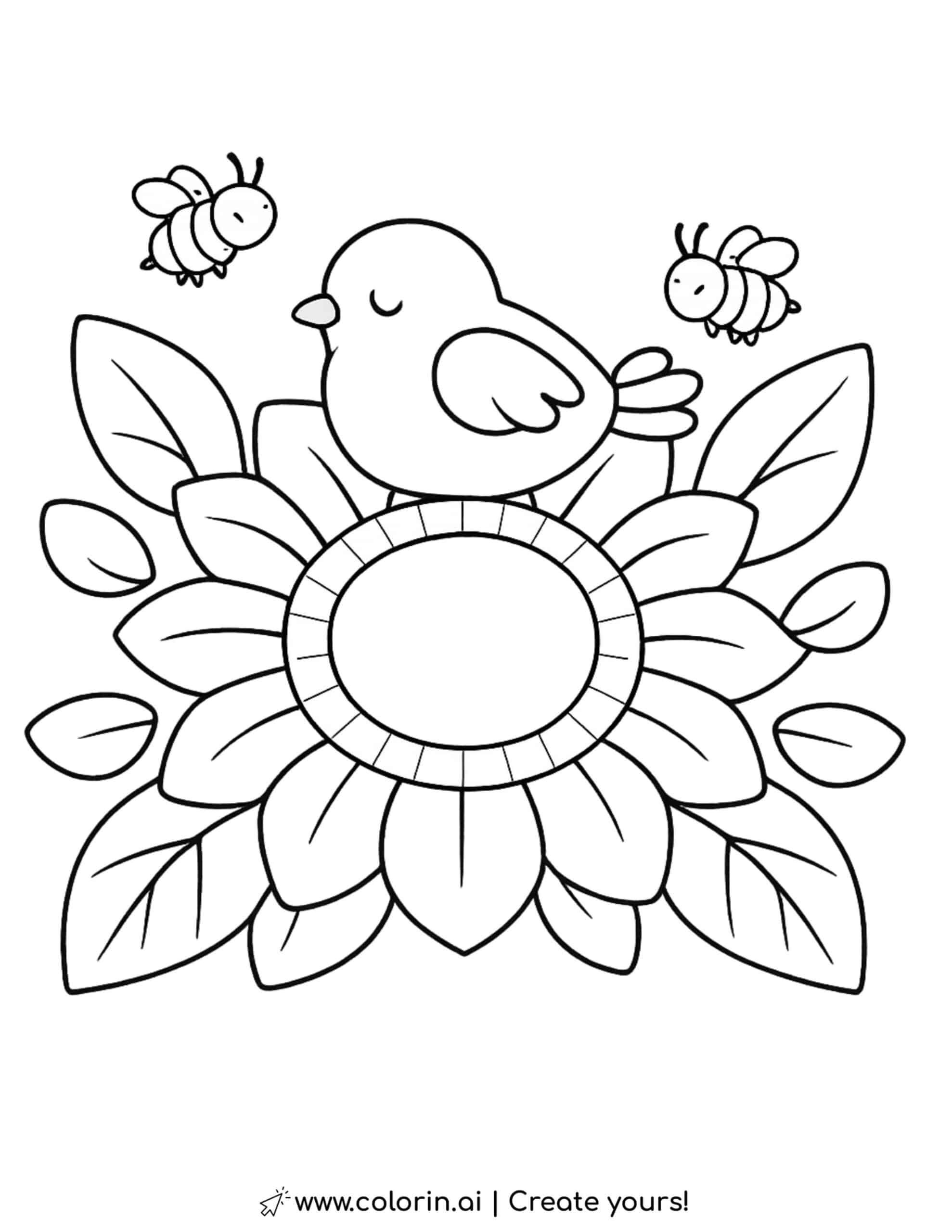 For this page, we entered the concept: bird resting on sunflower with bees coloring page on Colorin AI and generated a print ready coloring page in seconds.