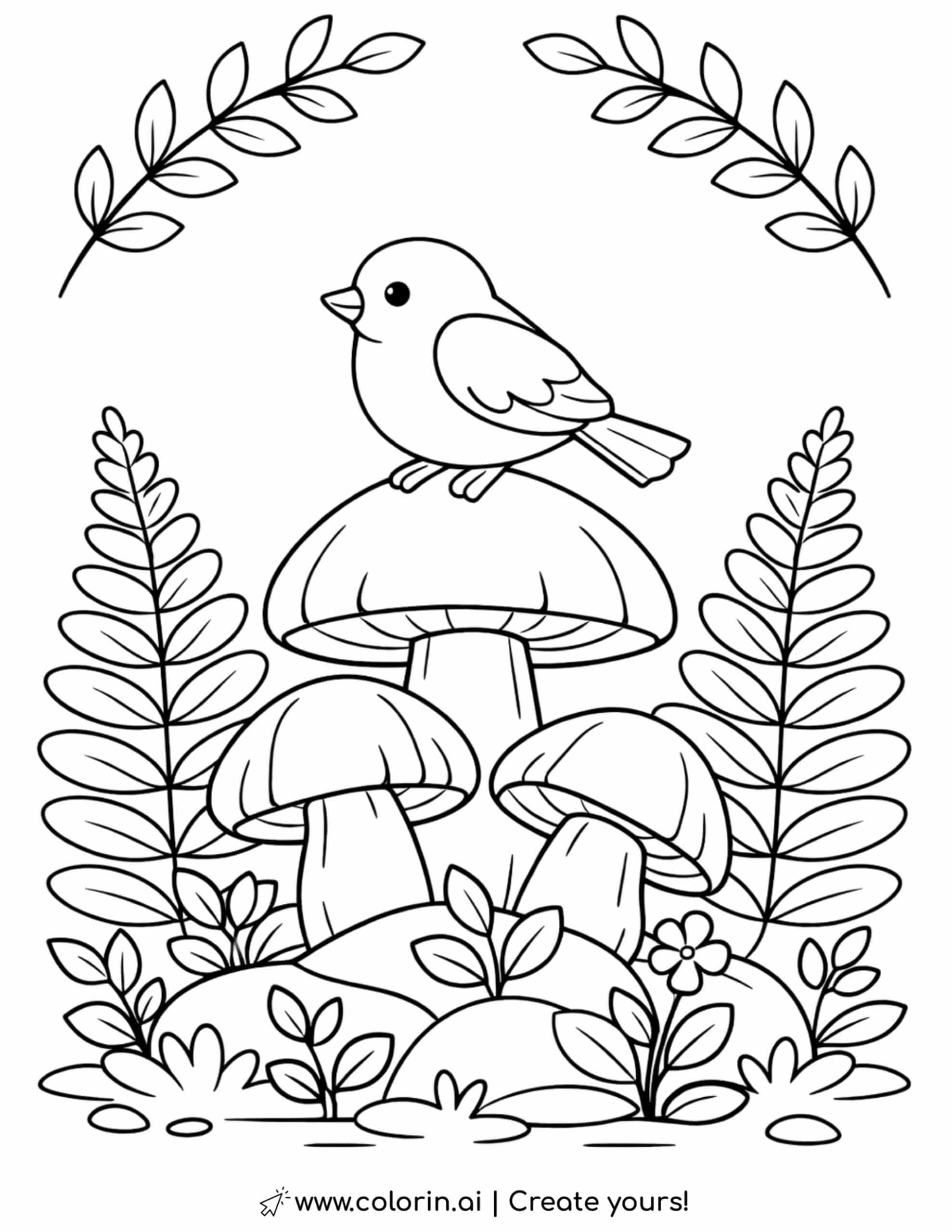 For this page, we entered the concept: bird sitting on forest mushrooms coloring page on Colorin AI and generated a print ready coloring page in seconds.