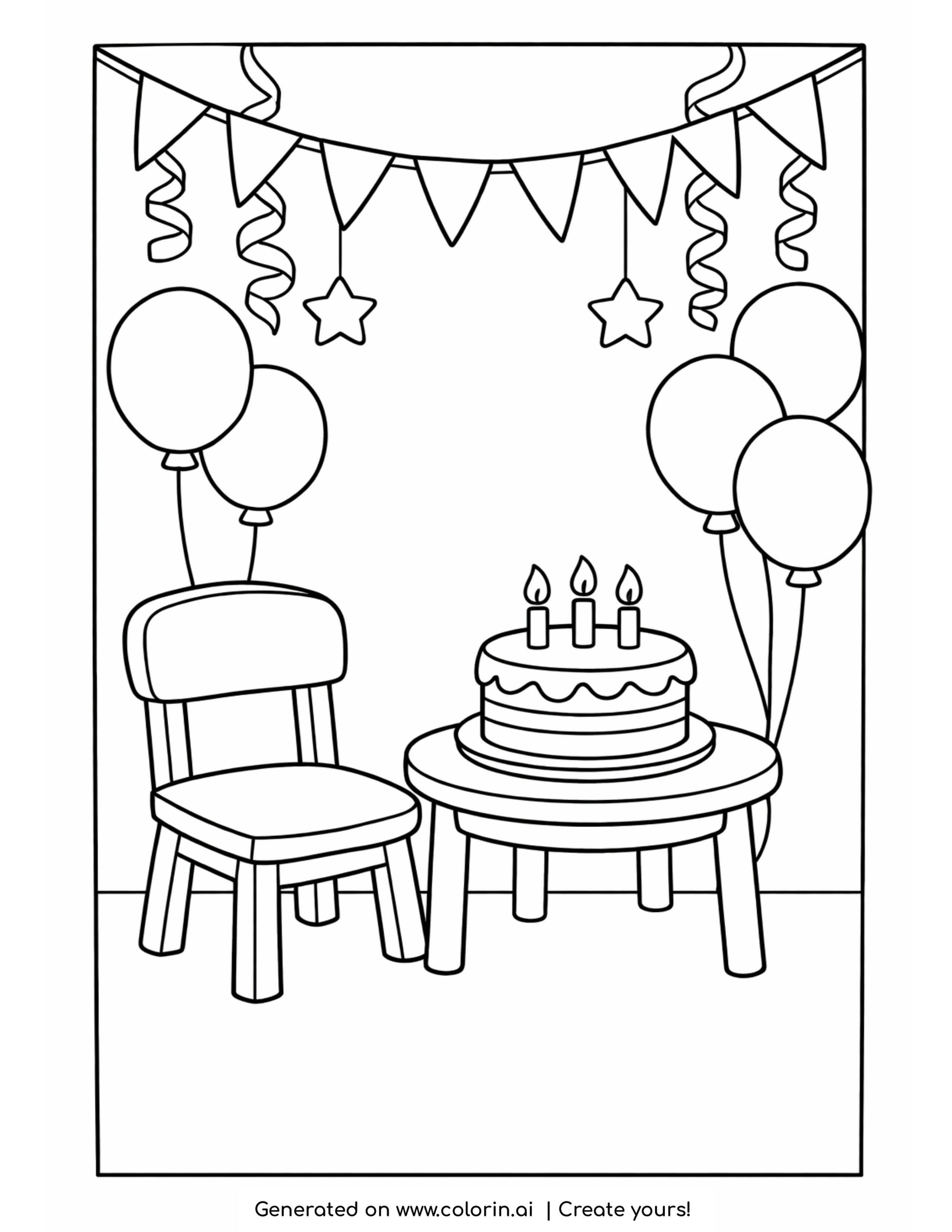 For this page, we entered the concept: birthday corner with cake and chair coloring page on Colorin AI and generated a print ready coloring page in seconds.