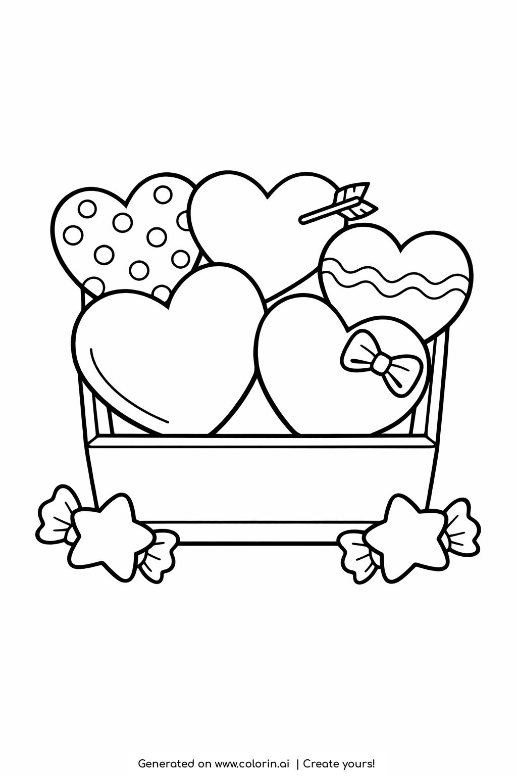 The box of decorated hearts and candies coloring page shows a small open box filled with large heart shapes in different designs. Some hearts have dots, others feature wavy lines, and one even has an arrow detail. Below the box, two wrapped star shaped candies add a sweet and playful touch to the scene.