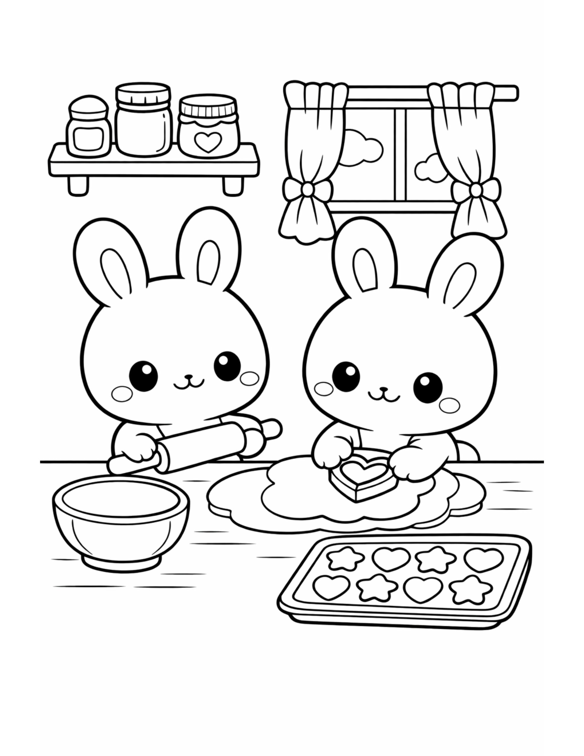 For this page, we entered the concept: “bunnies baking heart cookies coloring page with two bunnies baking at a table, a heart cookie cutter, a rolling pin, and a tray of cookies” on Colorin AI and generated a print ready coloring page in seconds.