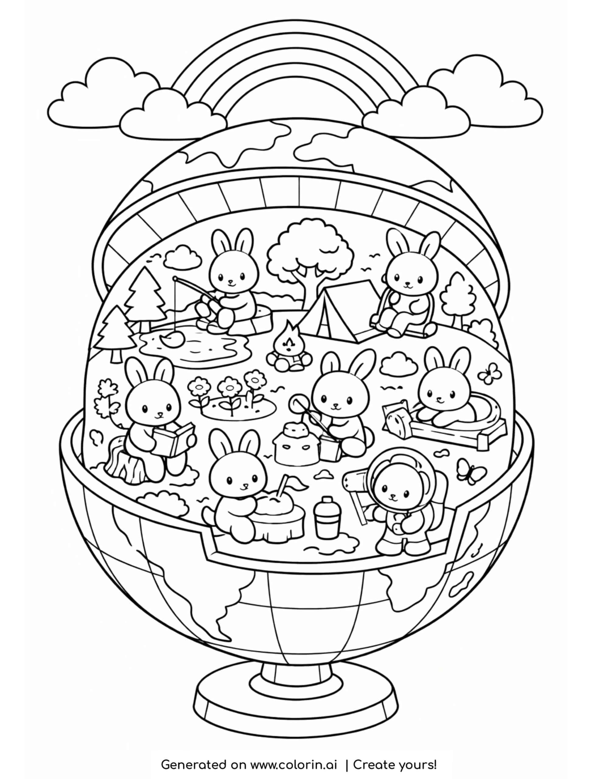 The bunnies inside a globe world coloring page shows a magical scene where multiple little rabbits live inside a large open globe. Each bunny is part of a tiny activity, surrounded by trees, clouds, and a rainbow above, creating a playful and detailed composition. This page is perfect for exploring creativity through many small scenes.