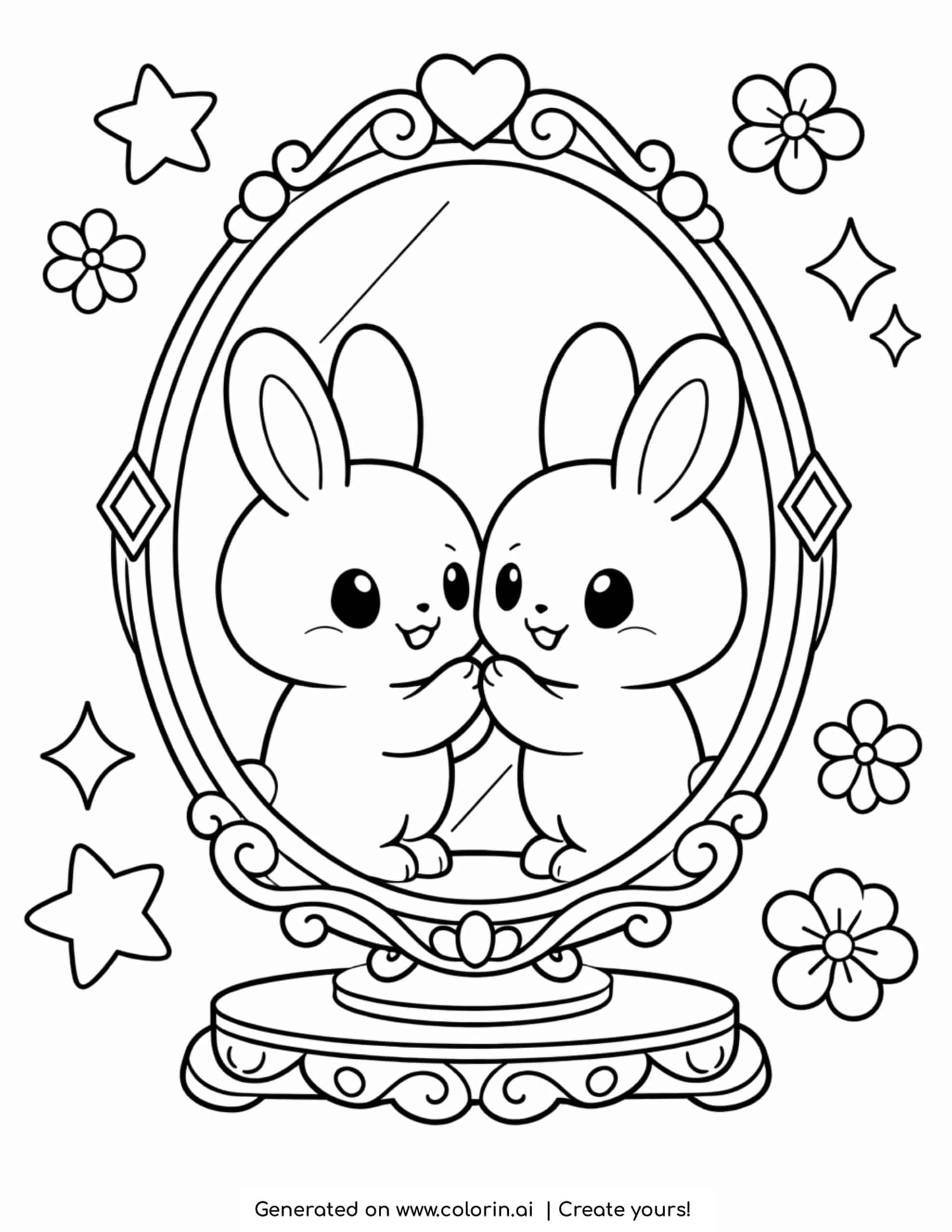 For this page, we entered the concept: bunny looking at mirror reflection coloring page on Colorin AI and generated a print ready coloring page in seconds.