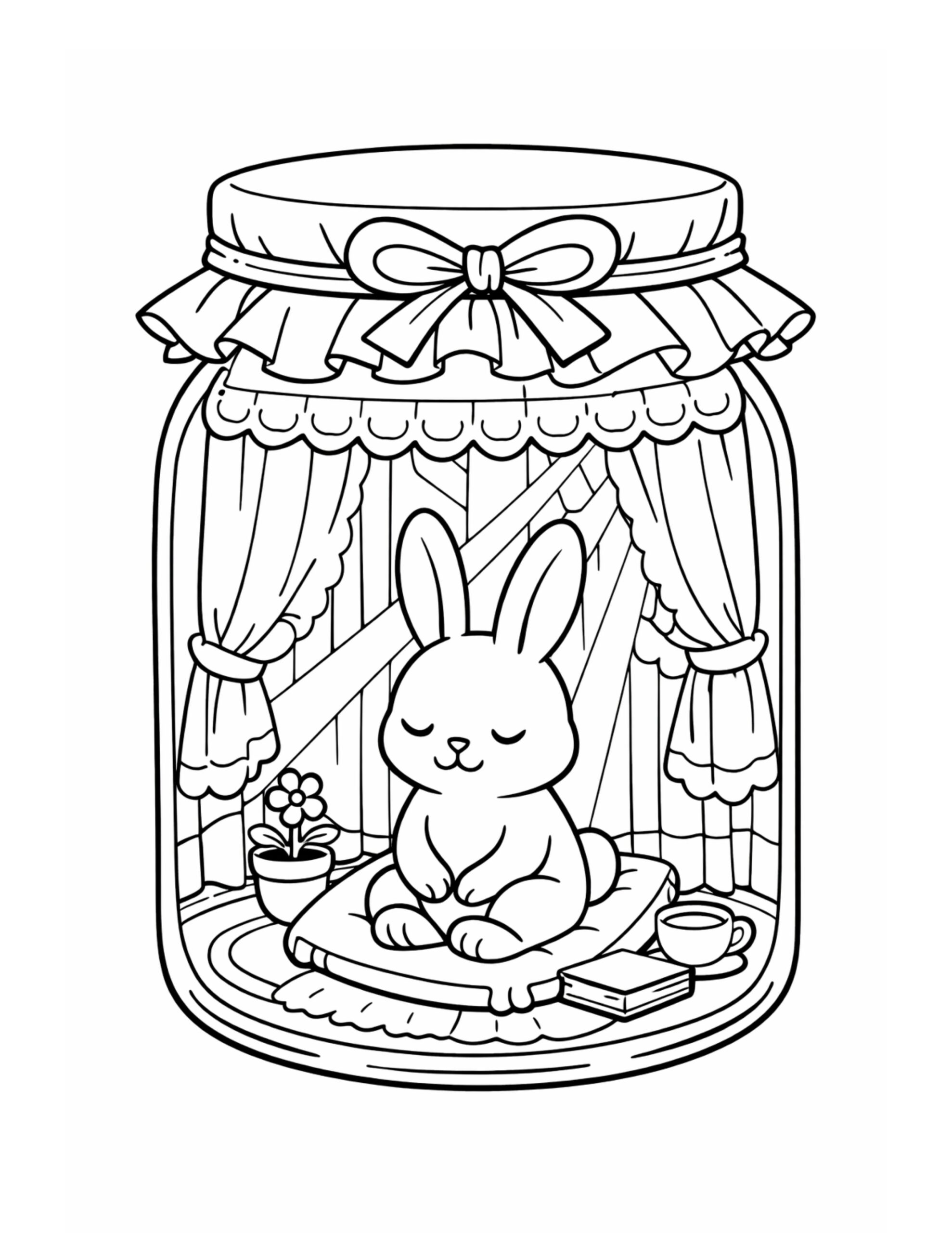 For this page, we entered the concept: “bunny resting on cushion jar coloring page” on Colorin AI and generated a print ready coloring page in seconds.