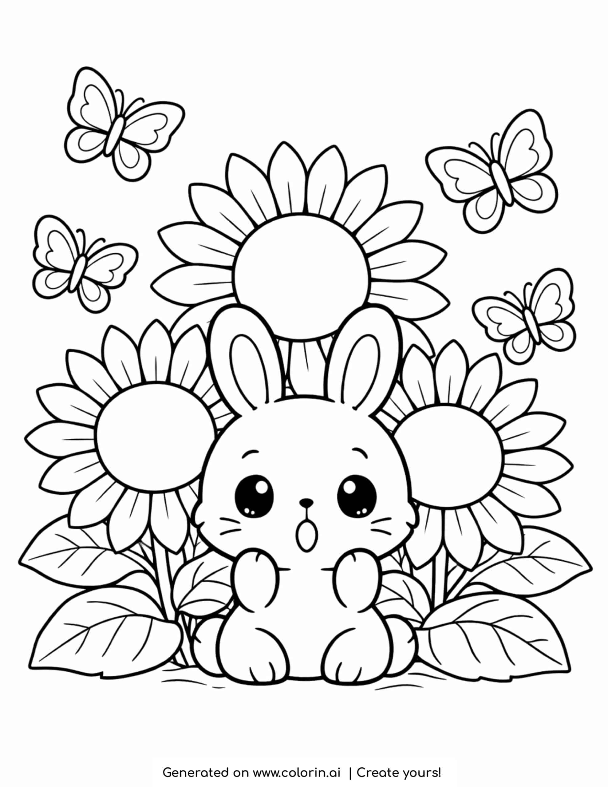 For this page, we entered the concept: bunny sitting among sunflowers coloring page on Colorin AI and generated a print ready coloring page in seconds.