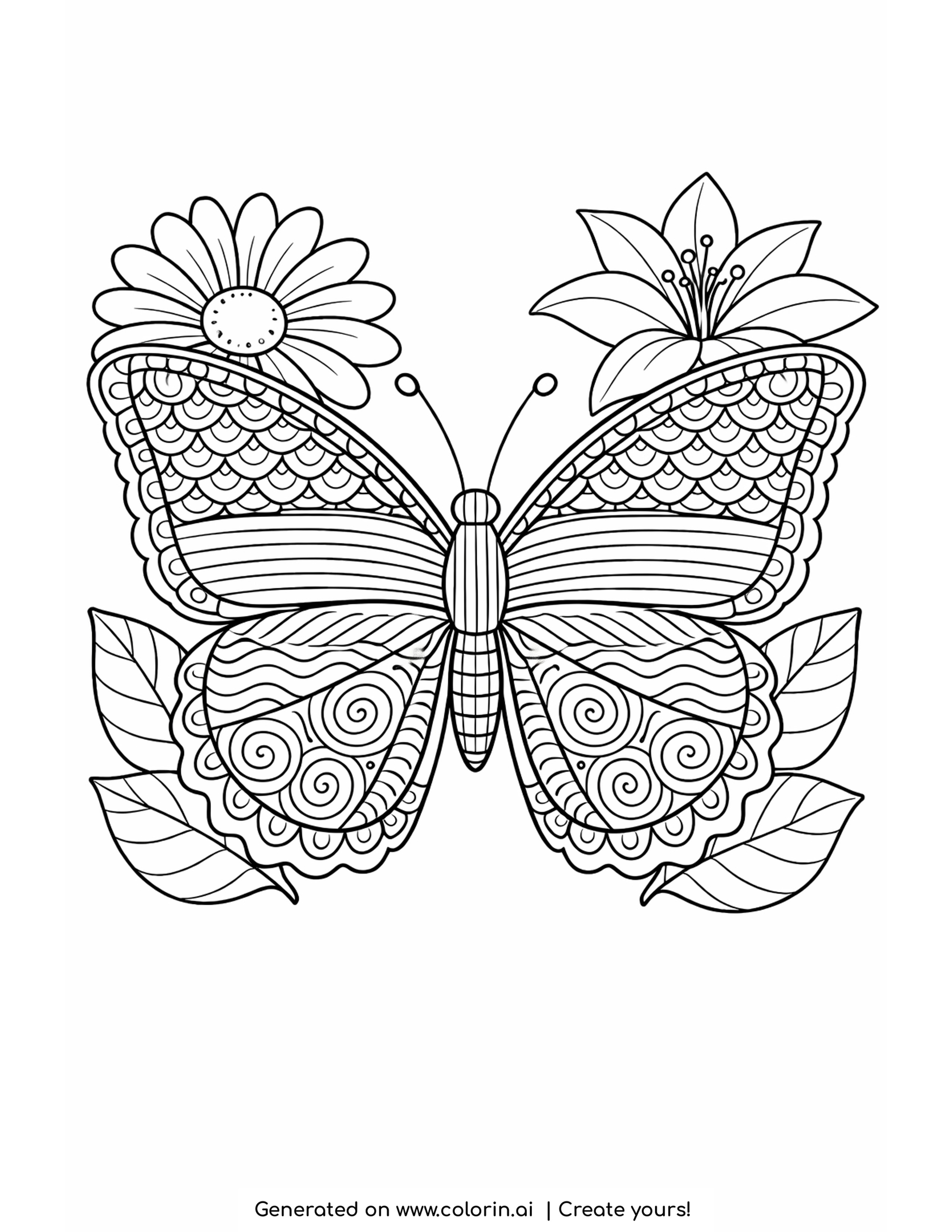 To begin with, we entered the concept: a large butterfly with open wings, decorative patterns, surrounded by flowers and leaves into Colorin AI, our AI coloring book generator. In just seconds, it generated a clean, high-quality illustration ready to enjoy. Moreover, this detailed insect drawing is ideal if you want to create a printable coloring book and share creative time with others.