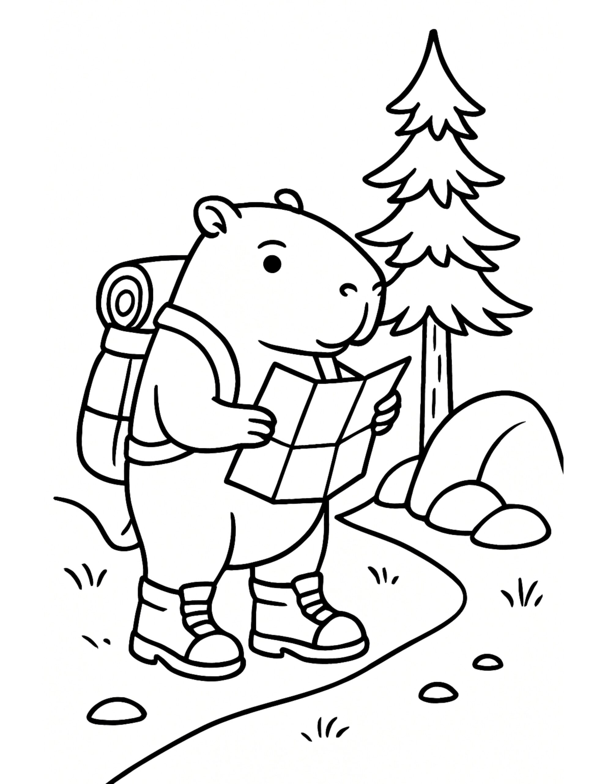 Capybara hiking with a map coloring page shows a cheerful capybara pausing beside a tall pine tree while carefully studying a folded map. At the same time, the backpack and sturdy boots add a playful sense of movement and discovery to the scene. Overall, it’s a calm nature moment with a gentle touch of adventure.
