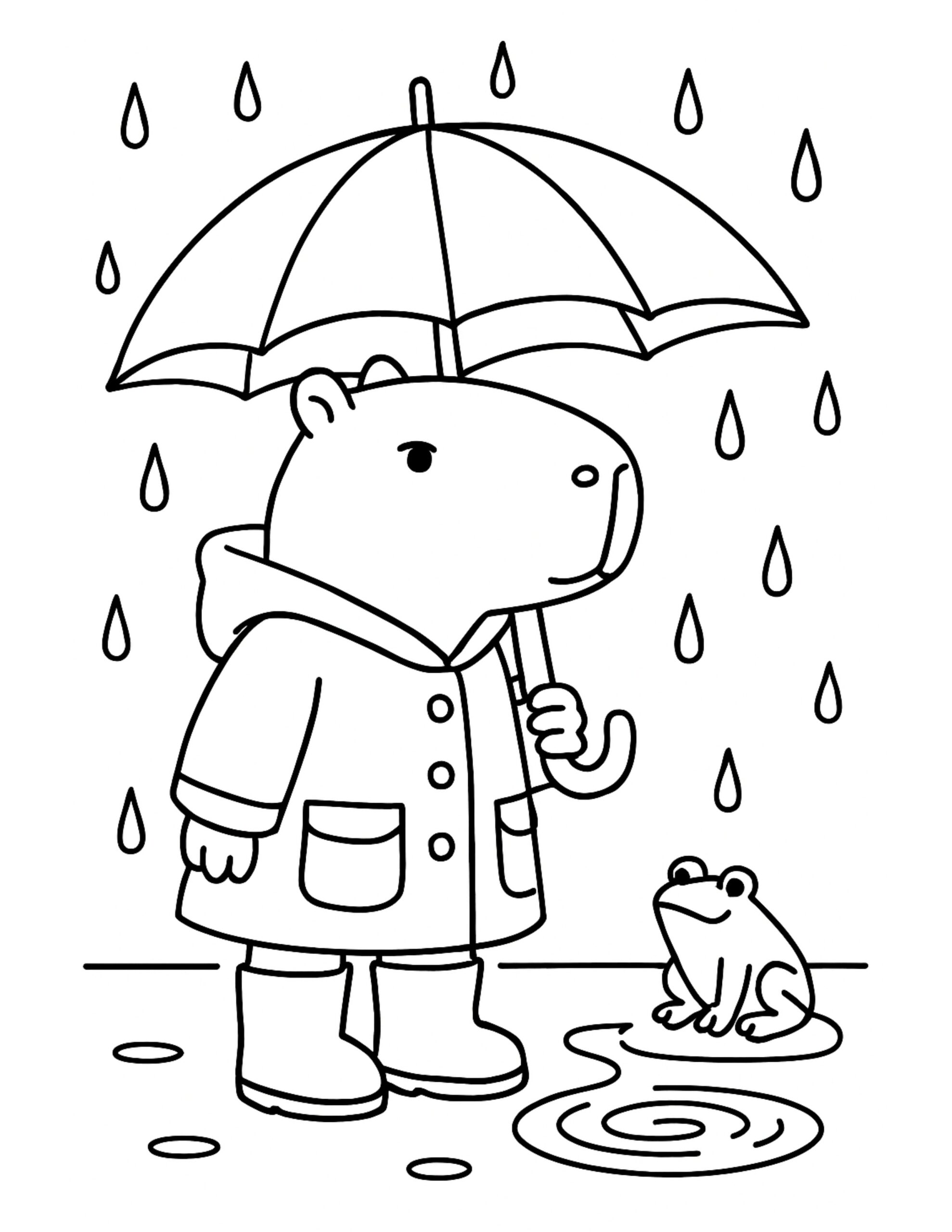 To begin, this capybara holding umbrella in rain coloring page shows a calm capybara in a raincoat and boots, standing under a big umbrella. Nearby, a tiny frog sits by a puddle while raindrops fall all around. Because the lines are bold and open, it feels relaxing to color and easy to finish in one cozy session.