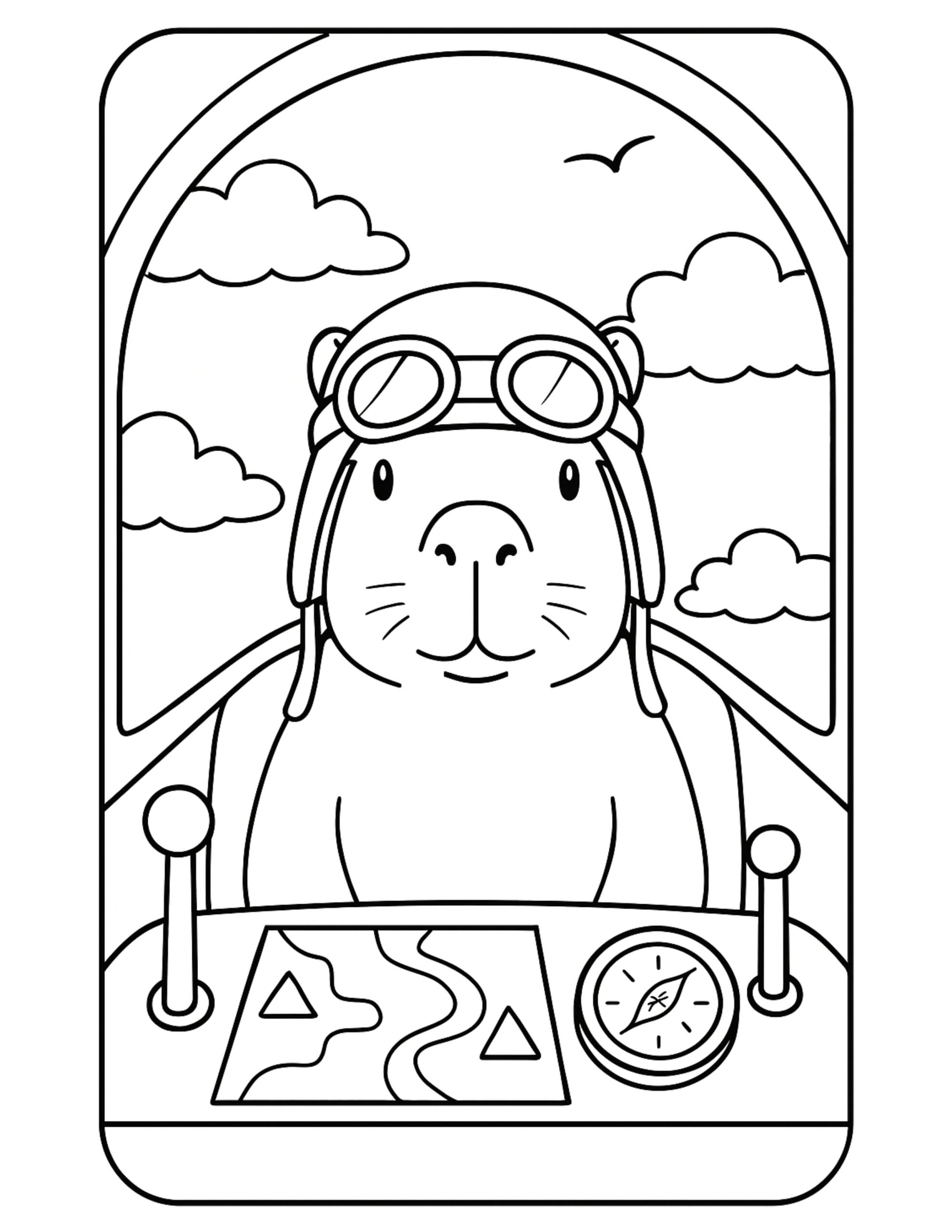 For this page, we entered the concept: “capybara pilot in cockpit coloring page” on Colorin AI and generated a print ready coloring page in seconds.