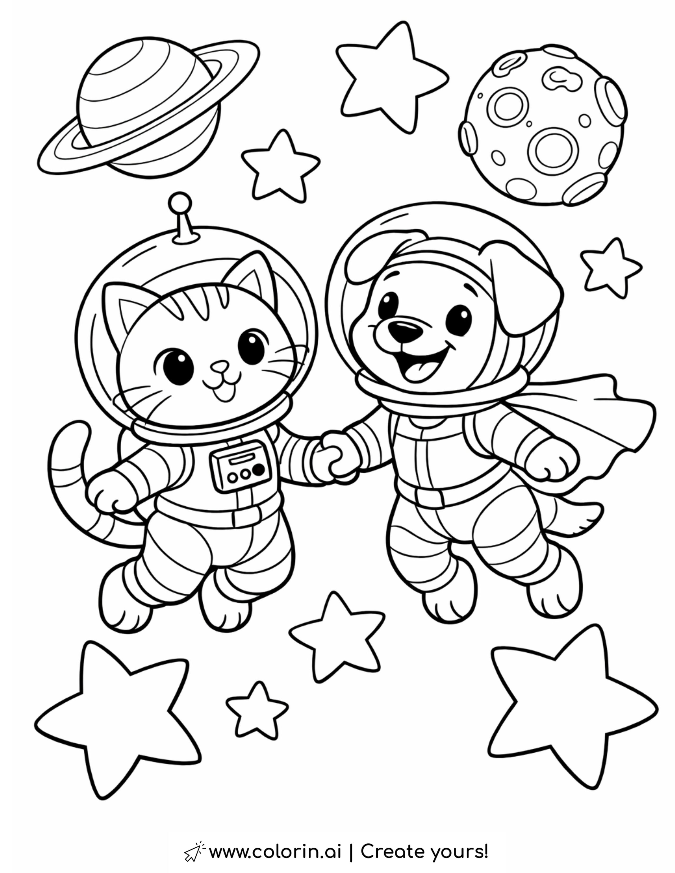 For this page, we entered the concept: cat and dog astronauts floating in space coloring page on Colorin AI and generated a print ready coloring page in seconds. Then we added playful details like planets and stars to make the illustration feel lively and engaging. This simple process allows anyone to create printable coloring pages or even full coloring books without drawing skills.
