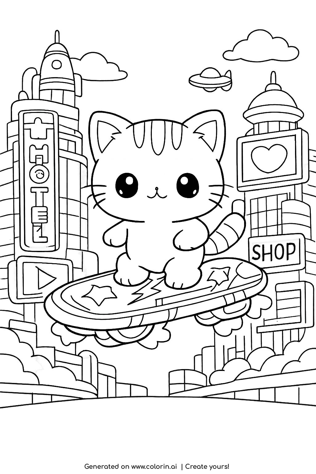 Cat Riding a Flying Hoverboard in a Futuristic City Coloring Page