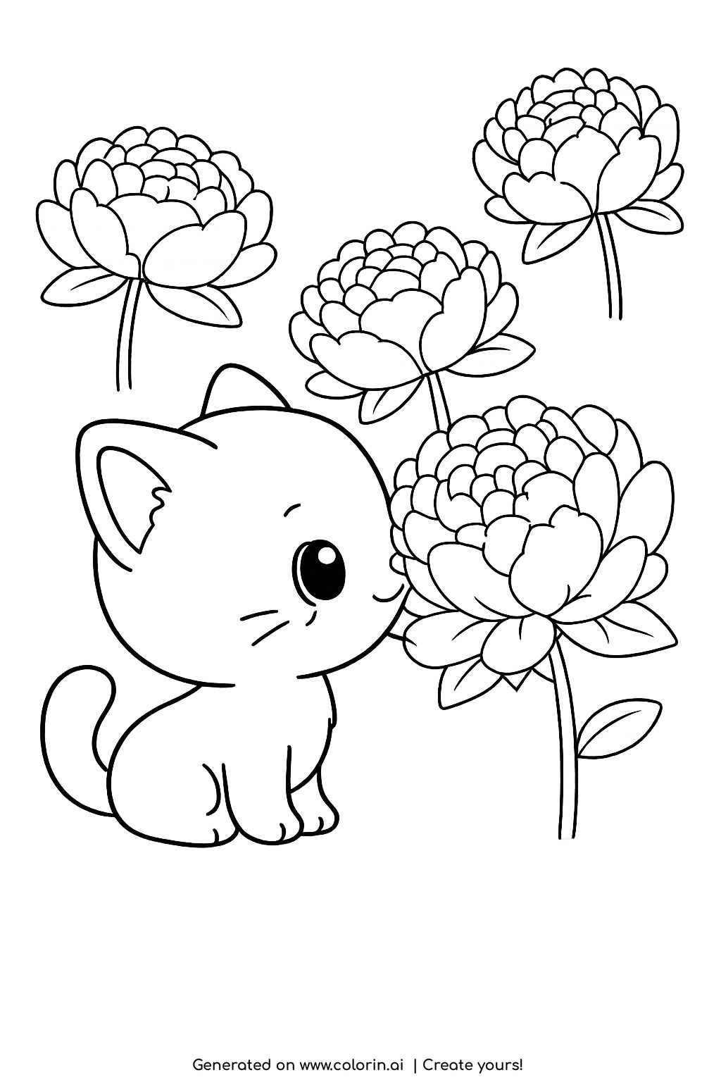 For this page, we entered the concept: cat smelling a peony coloring page on Colorin AI and generated a print ready coloring page in seconds.