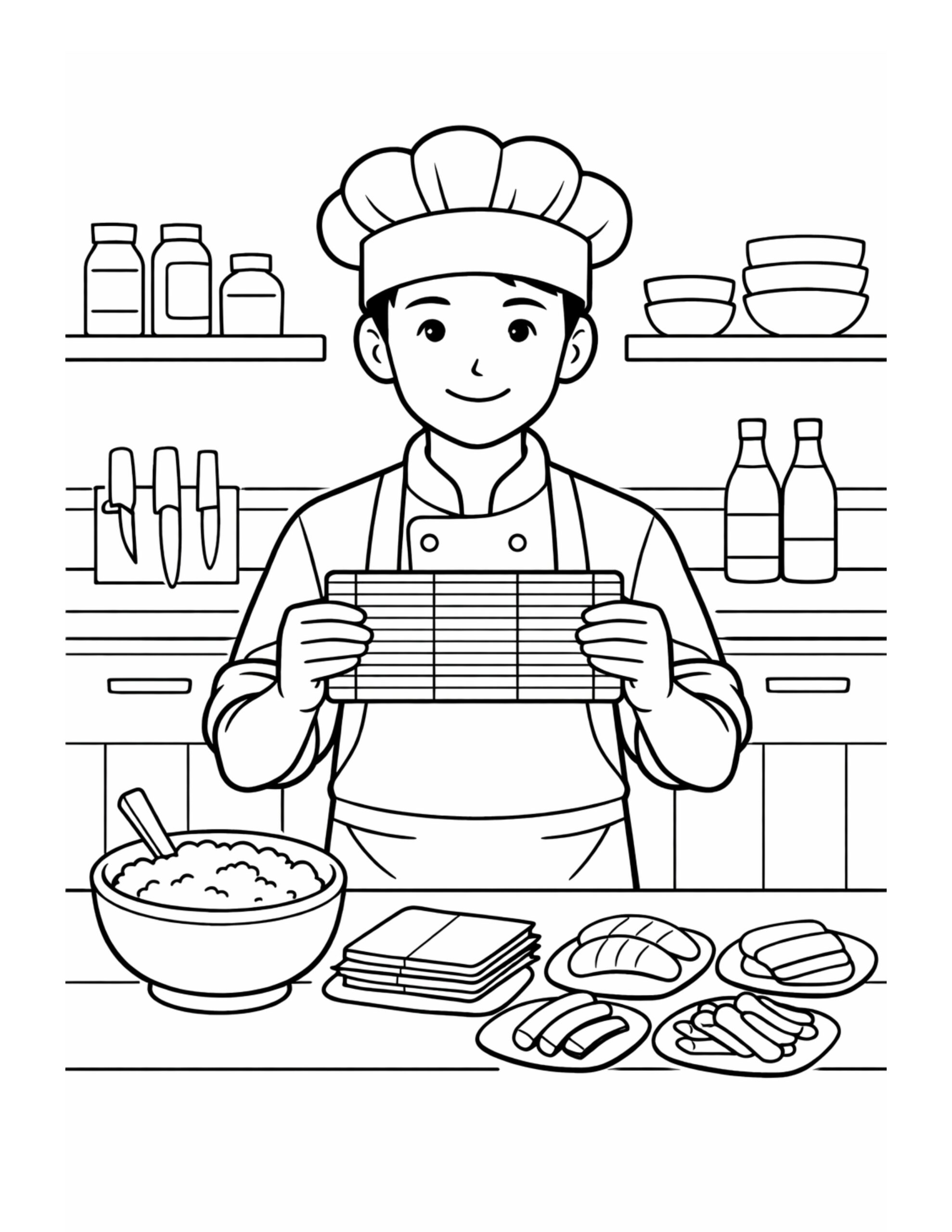 For this page, we entered the concept: “chef holding sushi rolling mat coloring page” on Colorin AI and generated a print ready coloring page in seconds.