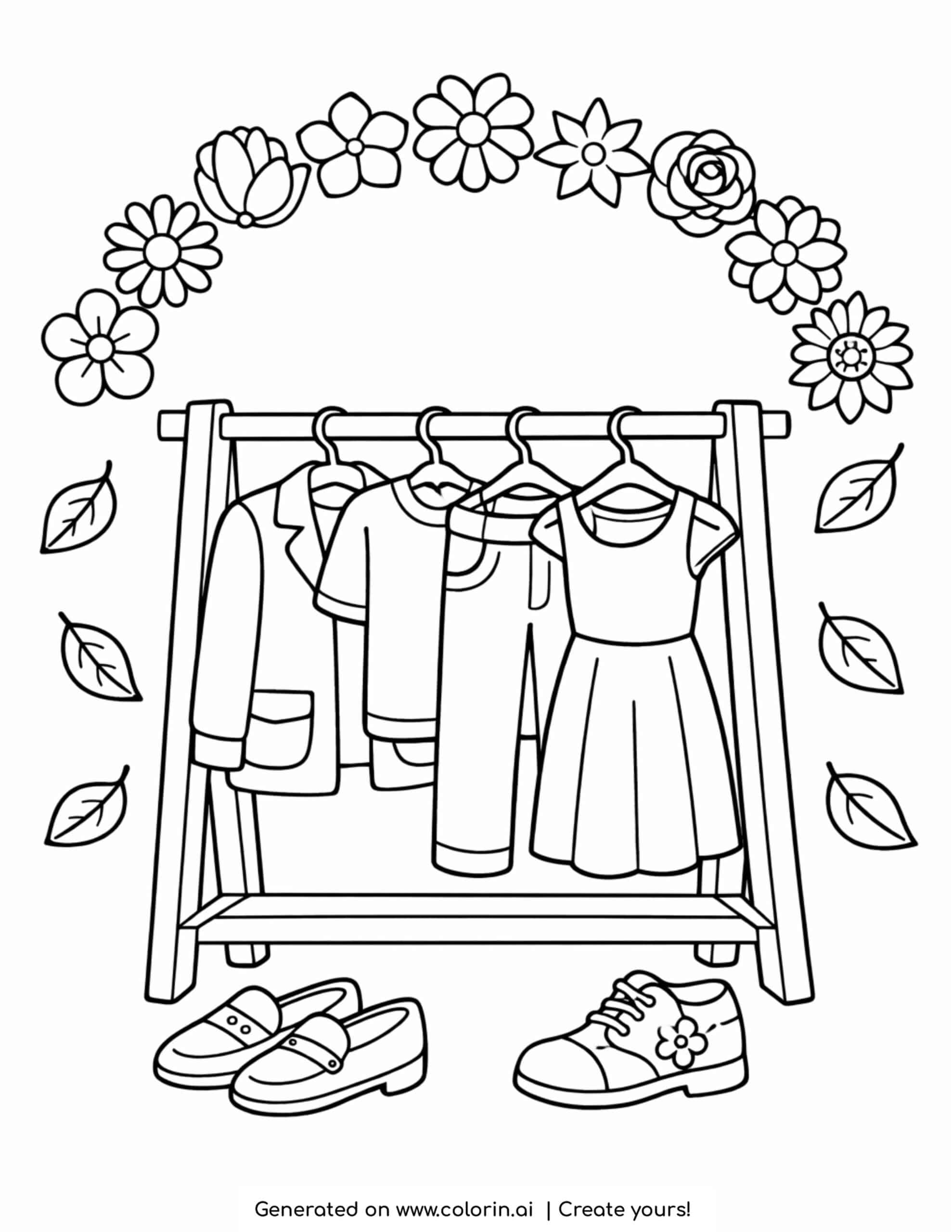The clothing rack with floral arch and shoes coloring page features a charming wooden rack holding stylish outfits, framed by a beautiful arch of flowers above. Shoes and scattered leaves add extra detail, creating a balanced and nature-inspired fashion scene.