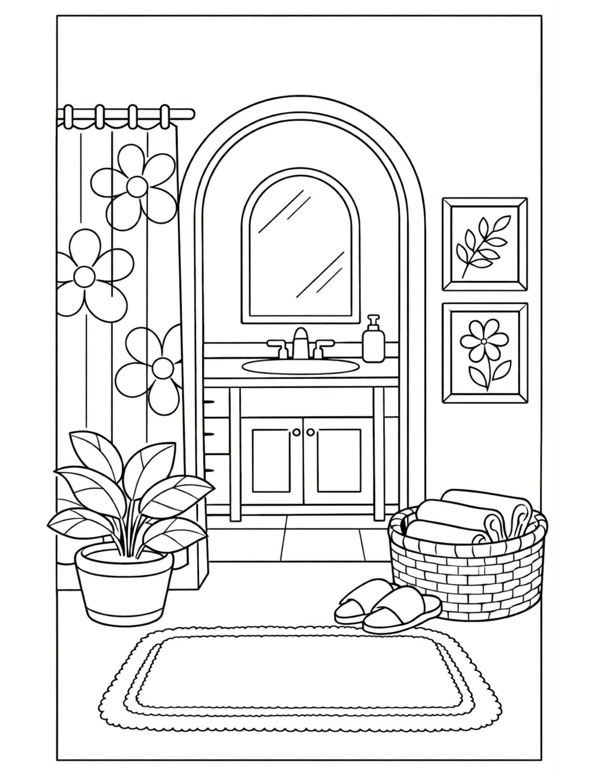 Because the scene has clear sections, it supports steady concentration without feeling cluttered. At the same time, coloring the small towel rolls and basket pattern can strengthen fine motor control. Moreover, choosing calm tones for a bathroom setting encourages relaxation and a slower pace.