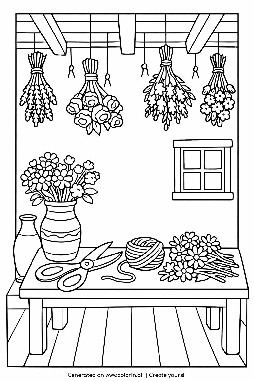 For this page, we entered the concept: cozy dried flower room coloring page on Colorin AI and generated a print ready coloring page in seconds. Then we added rustic cozy details to make the scene feel more alive, all in just a few minutes. You can follow the same process to create your own coloring pages, or build full coloring books without any design skills. For more creative inspiration, visit our Pinterest profile at https://www.pinterest.com/Colorin_ai/.