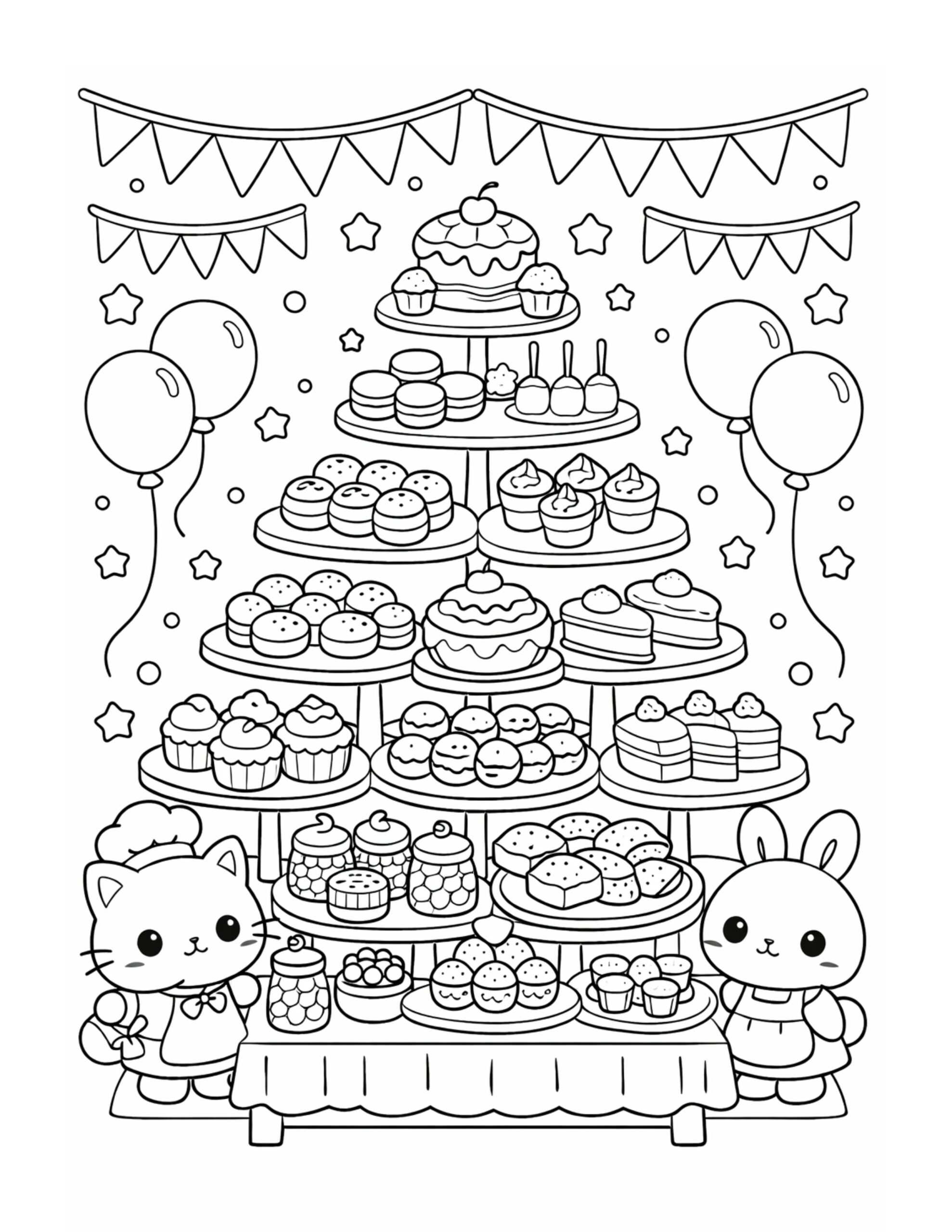 This coloring activity supports creativity by offering many small details and choices throughout the scene. Because the page includes repeating shapes and patterns, it naturally helps improve concentration and attention. At the same time, carefully coloring the desserts and characters strengthens fine motor skills. Moreover, the cheerful party setting encourages relaxation and positive emotions, making this page an enjoyable and calming coloring experience for all ages.