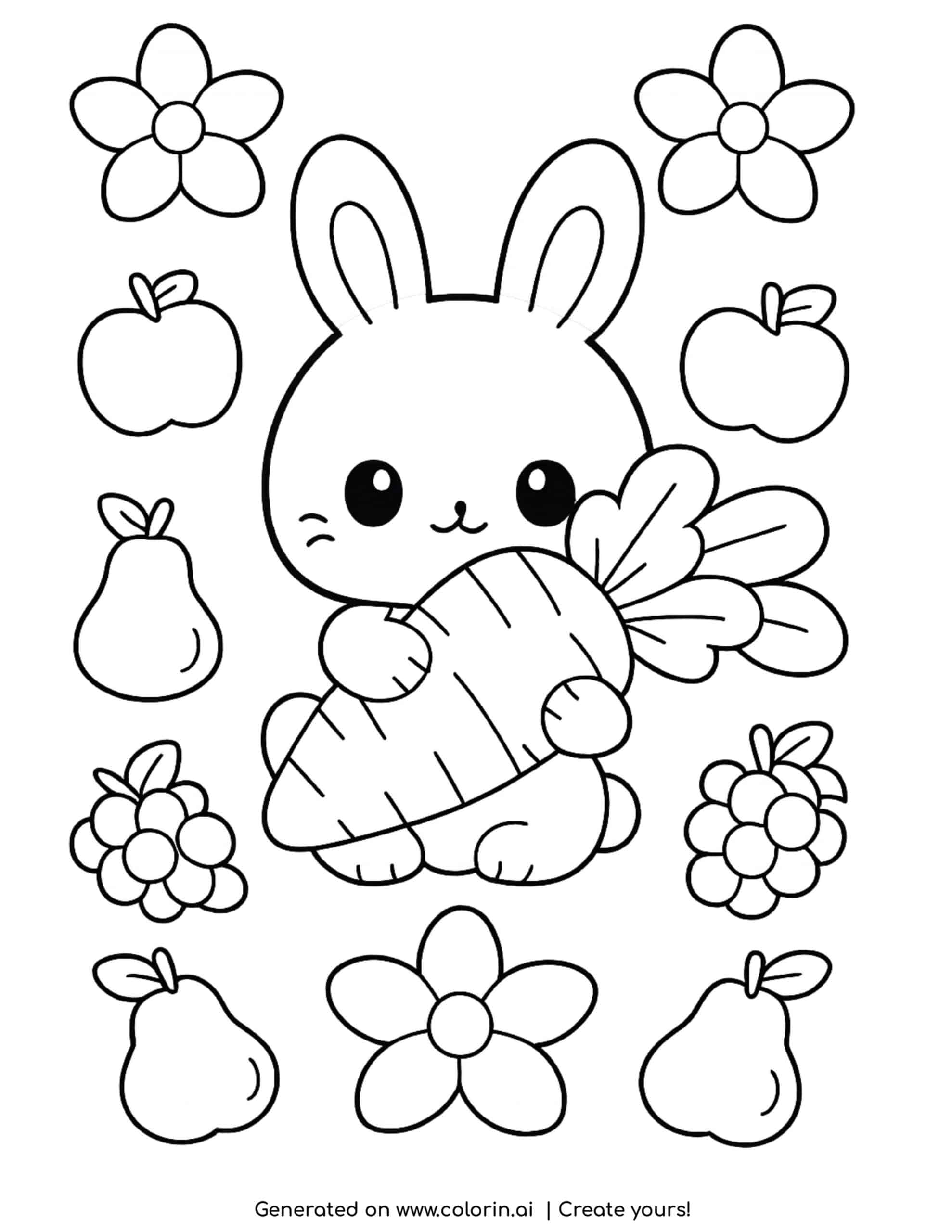 We added fruits and flowers around the bunny to make the scene more engaging and visually appealing. This combination of elements makes the page both playful and enjoyable to color. For more inspiration, visit our Pinterest profile.