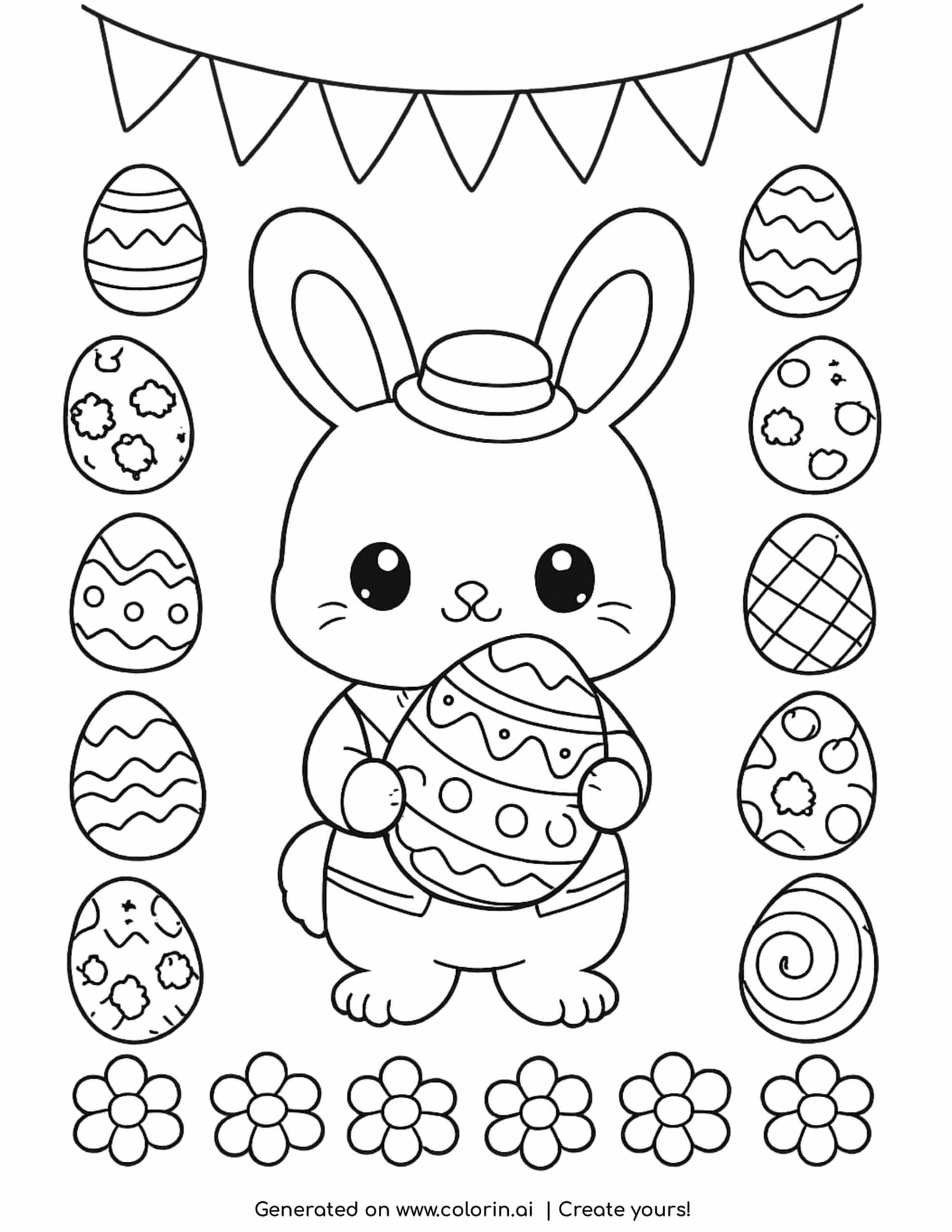 For this page, we entered the concept: cute Easter bunny coloring page with eggs on Colorin AI and generated a print ready coloring page in seconds.