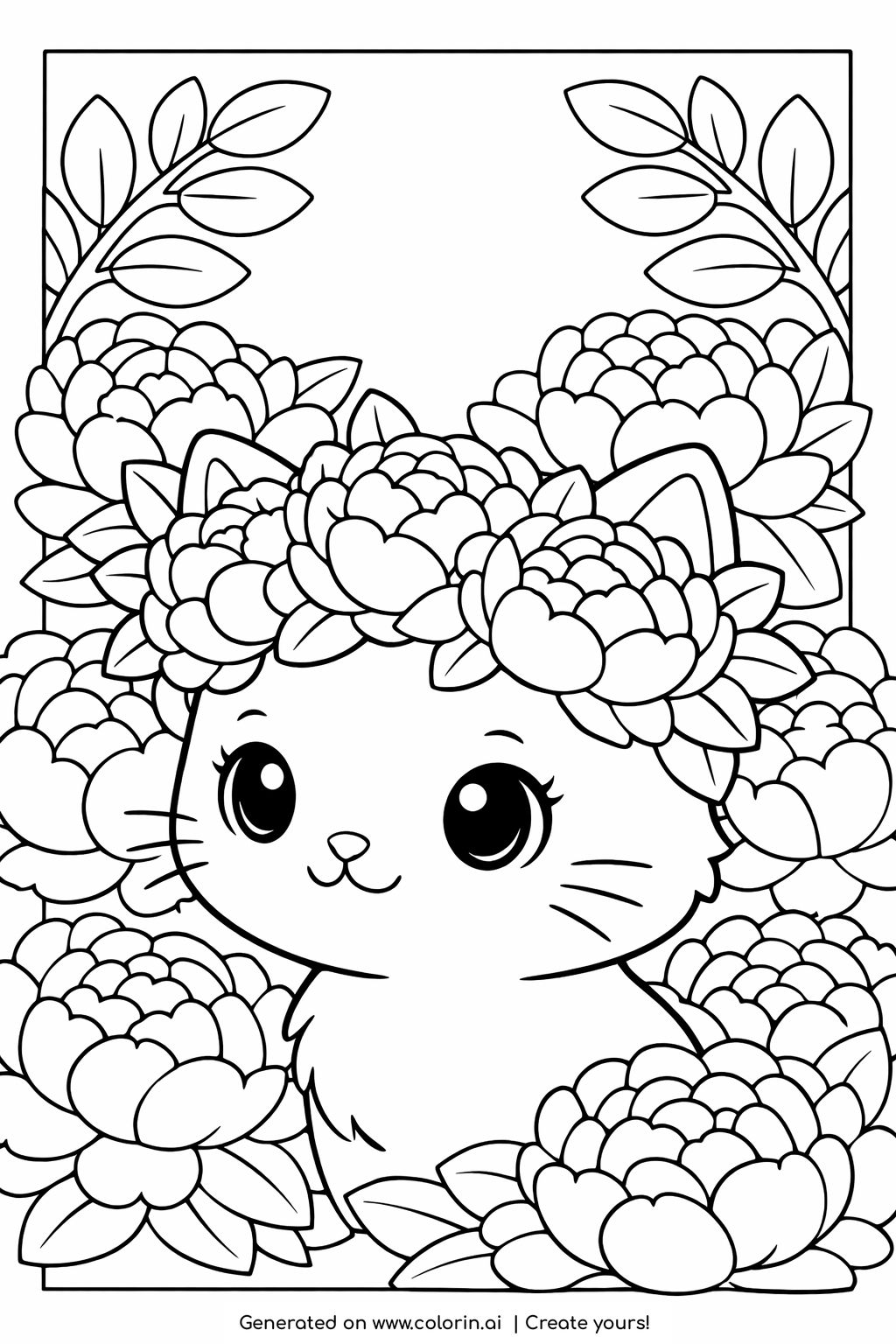 For this page, we entered the concept: cute kitten with peony crown coloring page on Colorin AI and generated a print ready coloring page in seconds.