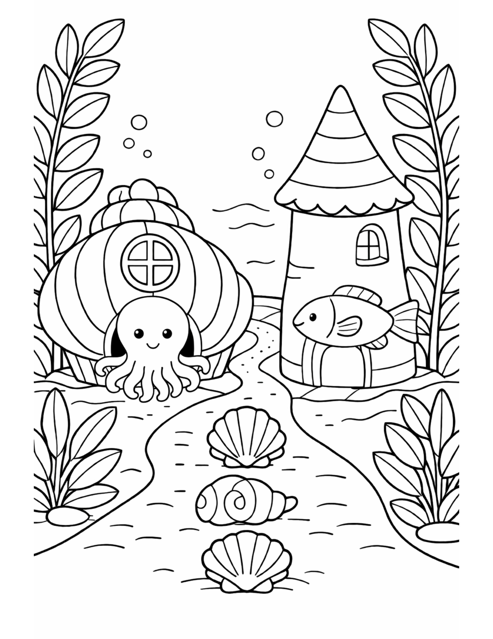 For this page, we entered the concept: “cute octopus at seashell house coloring page” on Colorin AI and generated a print ready coloring page in seconds.