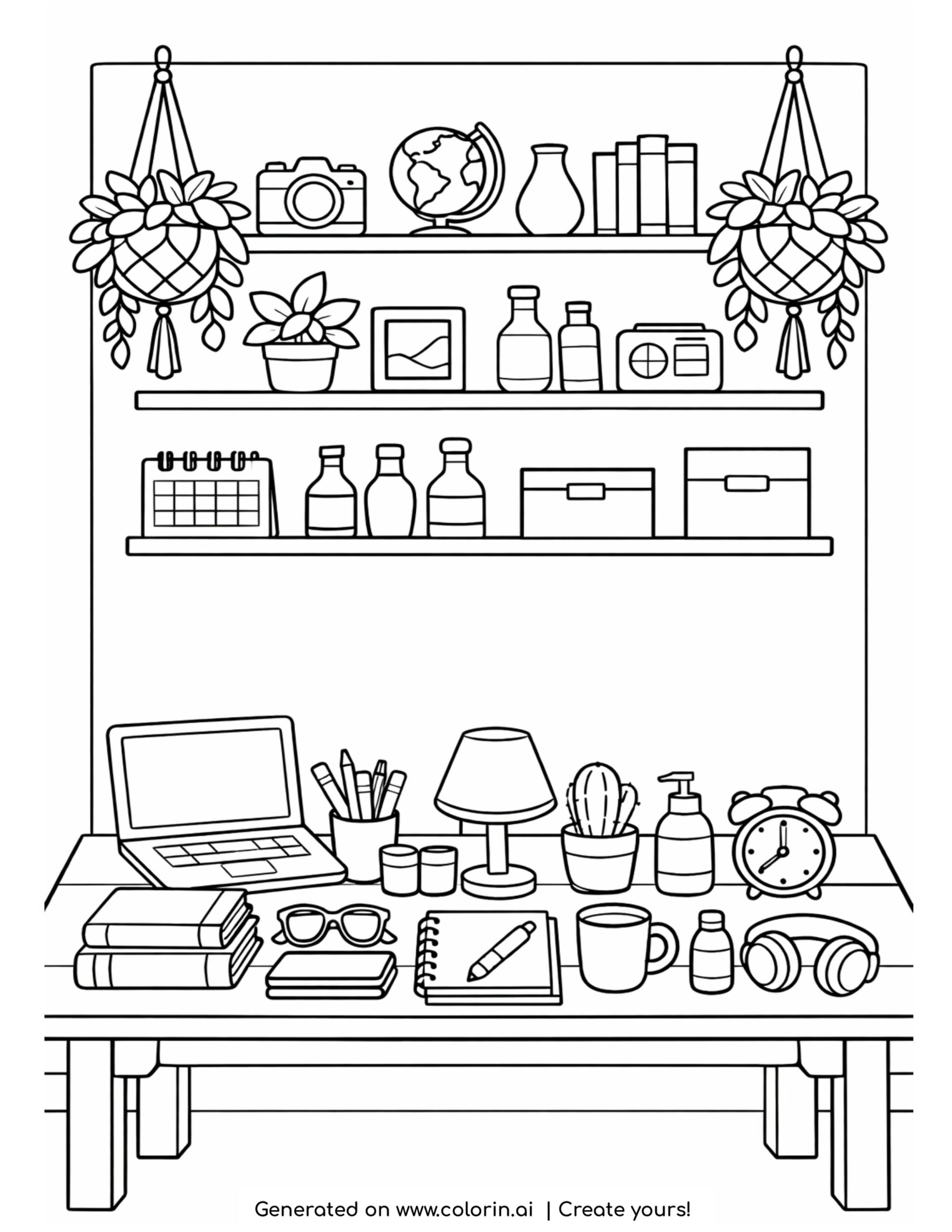 For this page, we entered the concept: desk with shelves and decor items coloring page on Colorin AI and generated a print ready coloring page in seconds. Then we added cozy and detailed elements to make the scene feel more alive, all in just a few minutes. You can follow the same process to create your own coloring pages, or build full coloring books without any design skills. For more creative inspiration, visit our Pinterest profile.