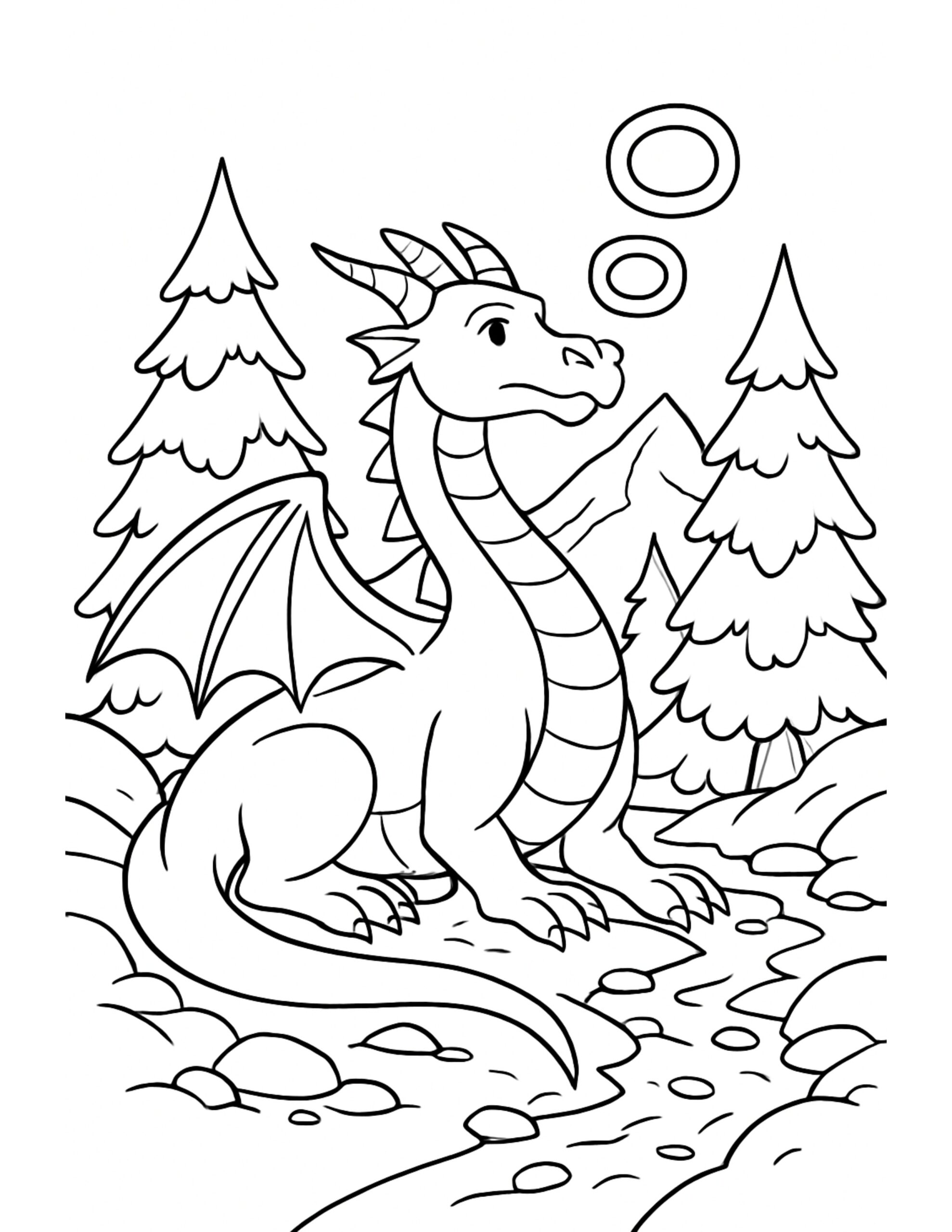 For this page, we entered the concept: “dragon resting by mountain creek coloring page, sitting beside a winding stream with pine trees and mountains in the background” on Colorin AI and generated a print ready coloring page in seconds.
