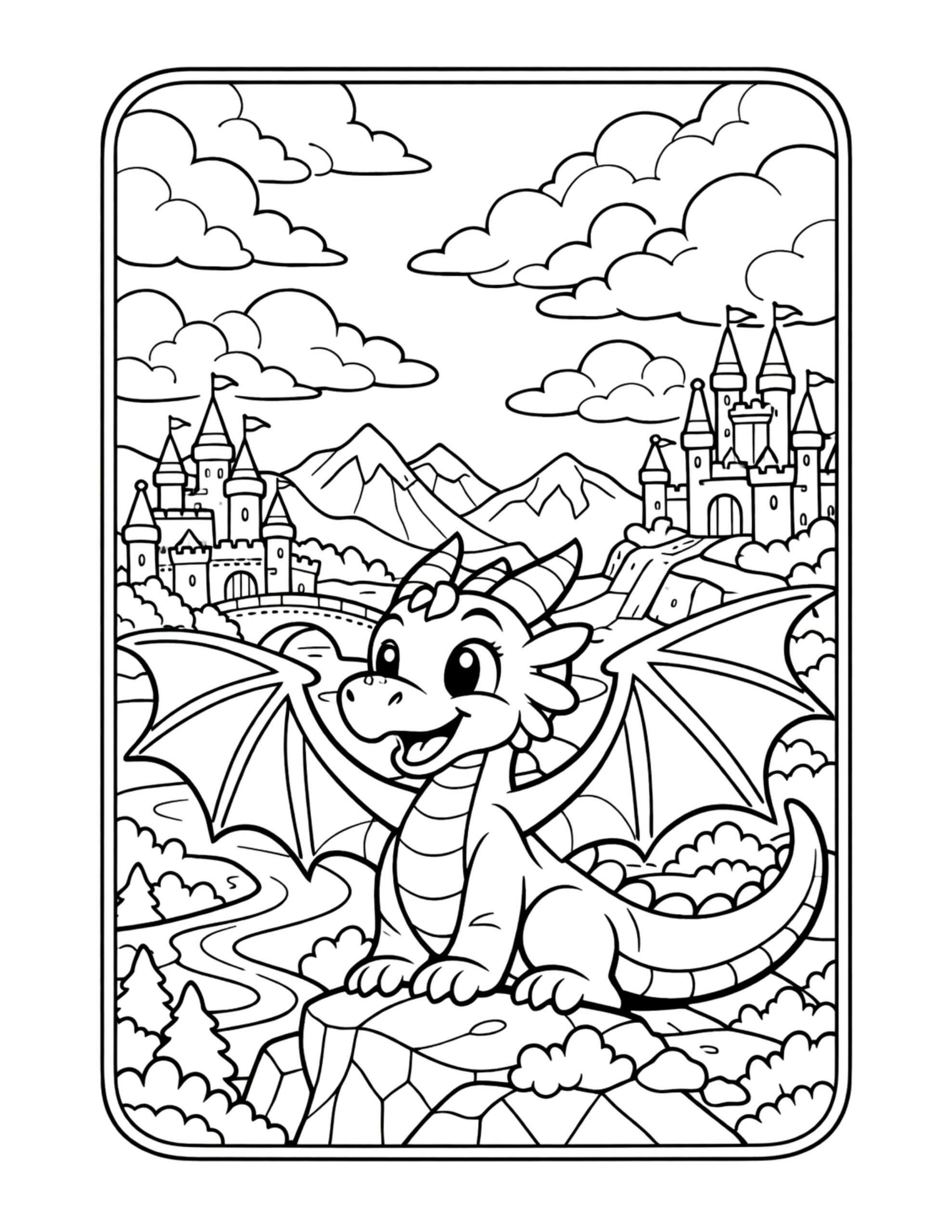 For this page, we entered the concept: “dragon sitting above castle valley coloring page with a cute dragon on a cliff, distant castles, mountains, and layered clouds in the sky” on Colorin AI and generated a print ready coloring page in seconds.