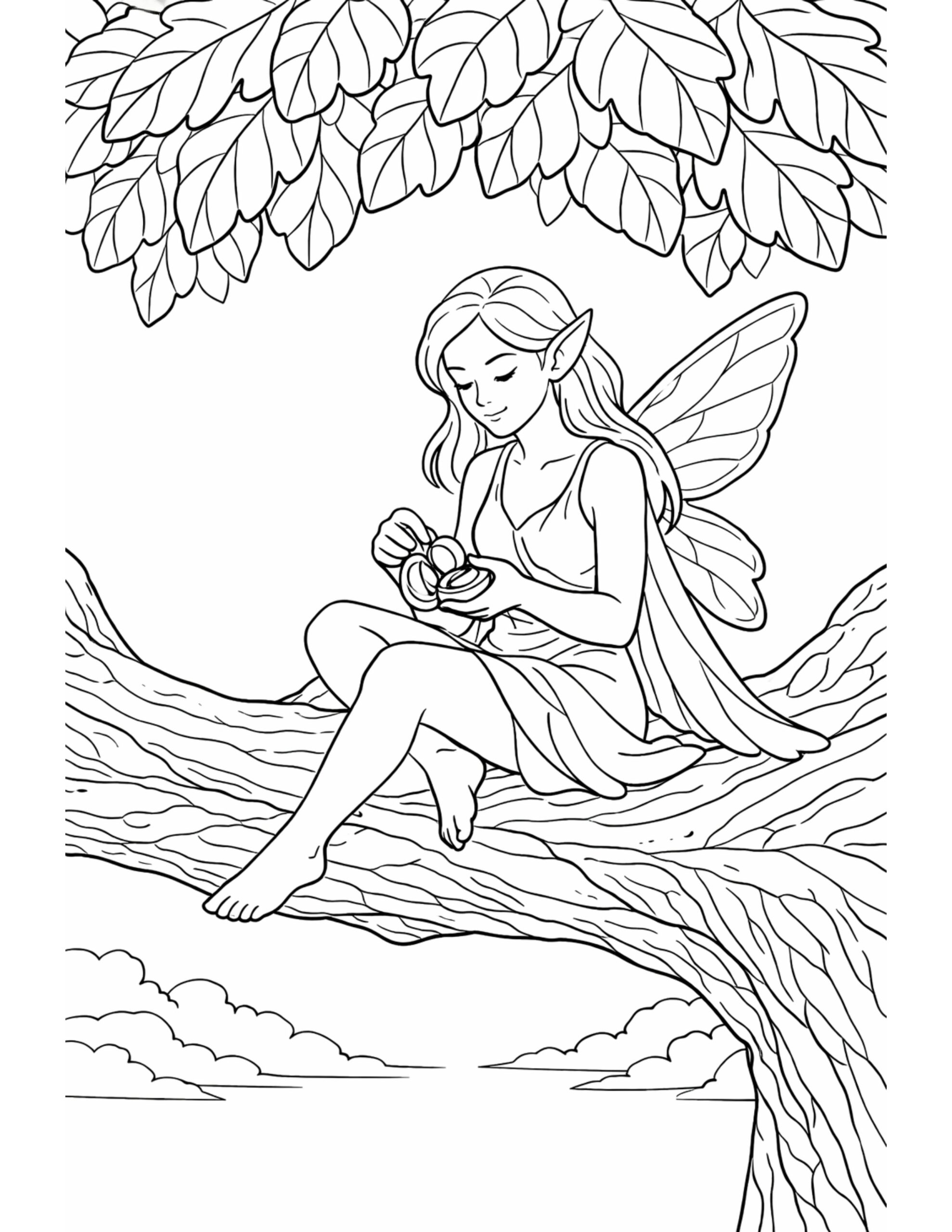 The fairy holding flower on branch coloring page shows a gentle fairy sitting on a wide tree limb beneath a leafy canopy. At the same time, her calm expression and careful hands make the scene feel quiet and sweet. Because the background is open and airy, it is fun to add your own colors and mood.