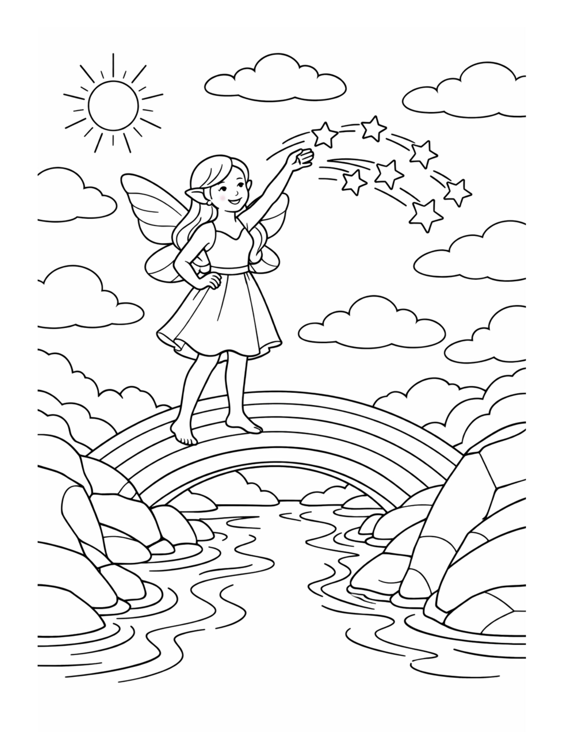 Coloring this illustration supports relaxation and emotional balance, especially because of its peaceful fantasy setting. In addition, focusing on the fairy, rainbow, and flowing water helps improve concentration and fine motor skills. As a result, this activity encourages creativity while offering a calming break from daily routines. Over time, it can also inspire imagination and mindful focus through gentle, repetitive coloring movements.