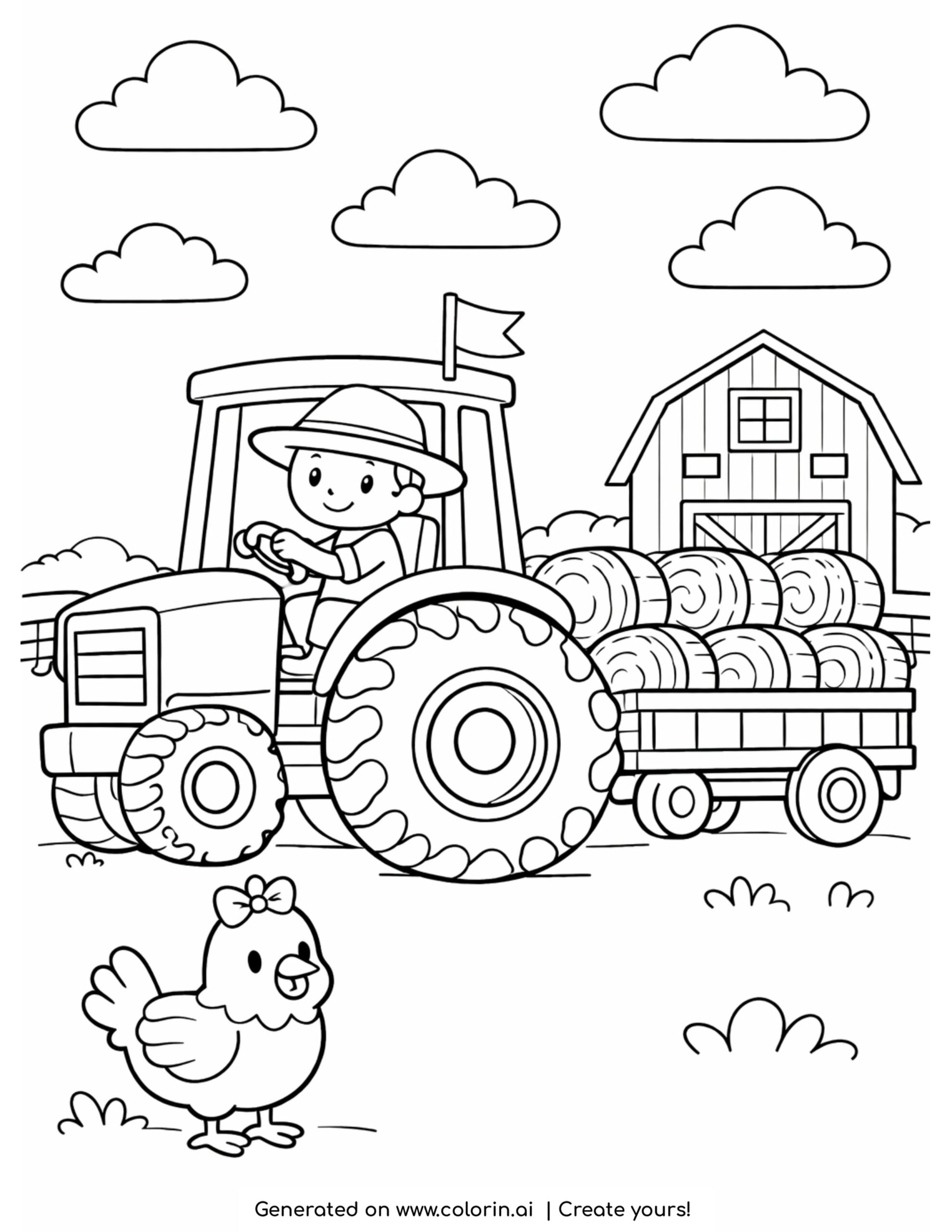 For this page, we entered the concept: farmer driving tractor with hay and chicken coloring page on Colorin AI and generated a print ready coloring page in seconds.