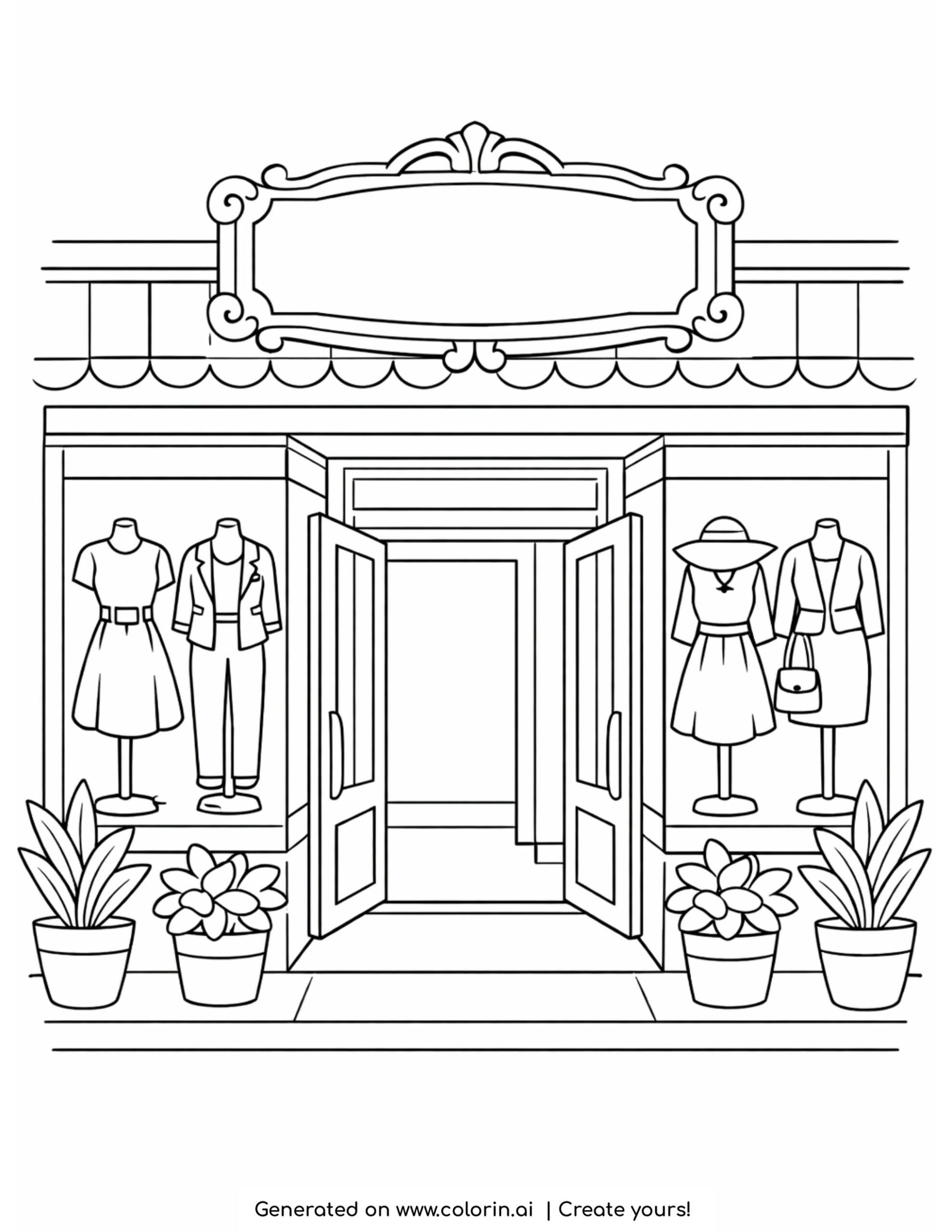 The fashion boutique storefront with window displays coloring page shows a charming shop entrance with open doors, mannequins dressed in stylish outfits, and decorative plants on each side. It creates an inviting and elegant scene that makes coloring both fun and relaxing.