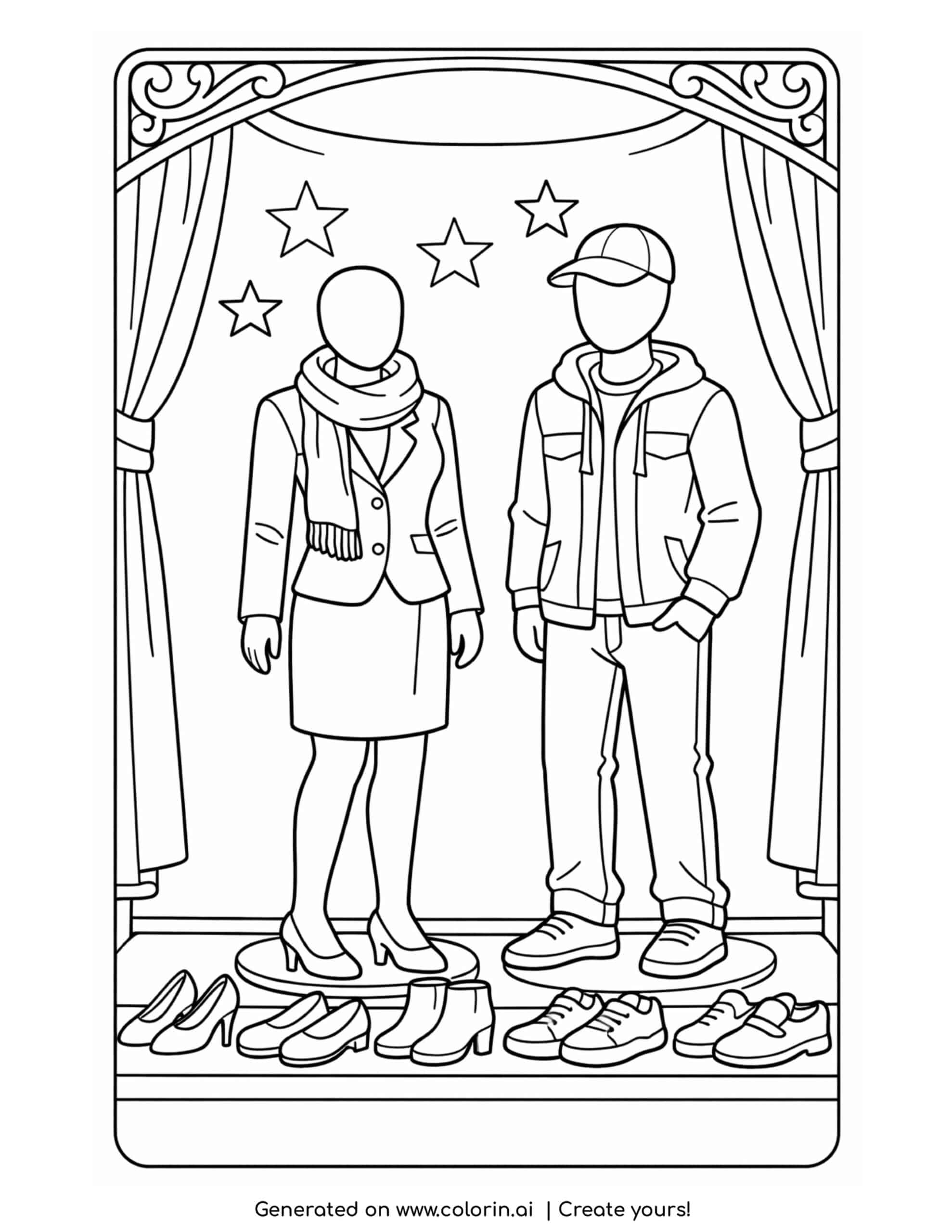 The fashion mannequins with outfits in display window coloring page shows two stylish figures dressed in coordinated outfits, standing inside a decorative shop window. It creates a fashionable and elegant scene that makes coloring both fun and visually engaging.