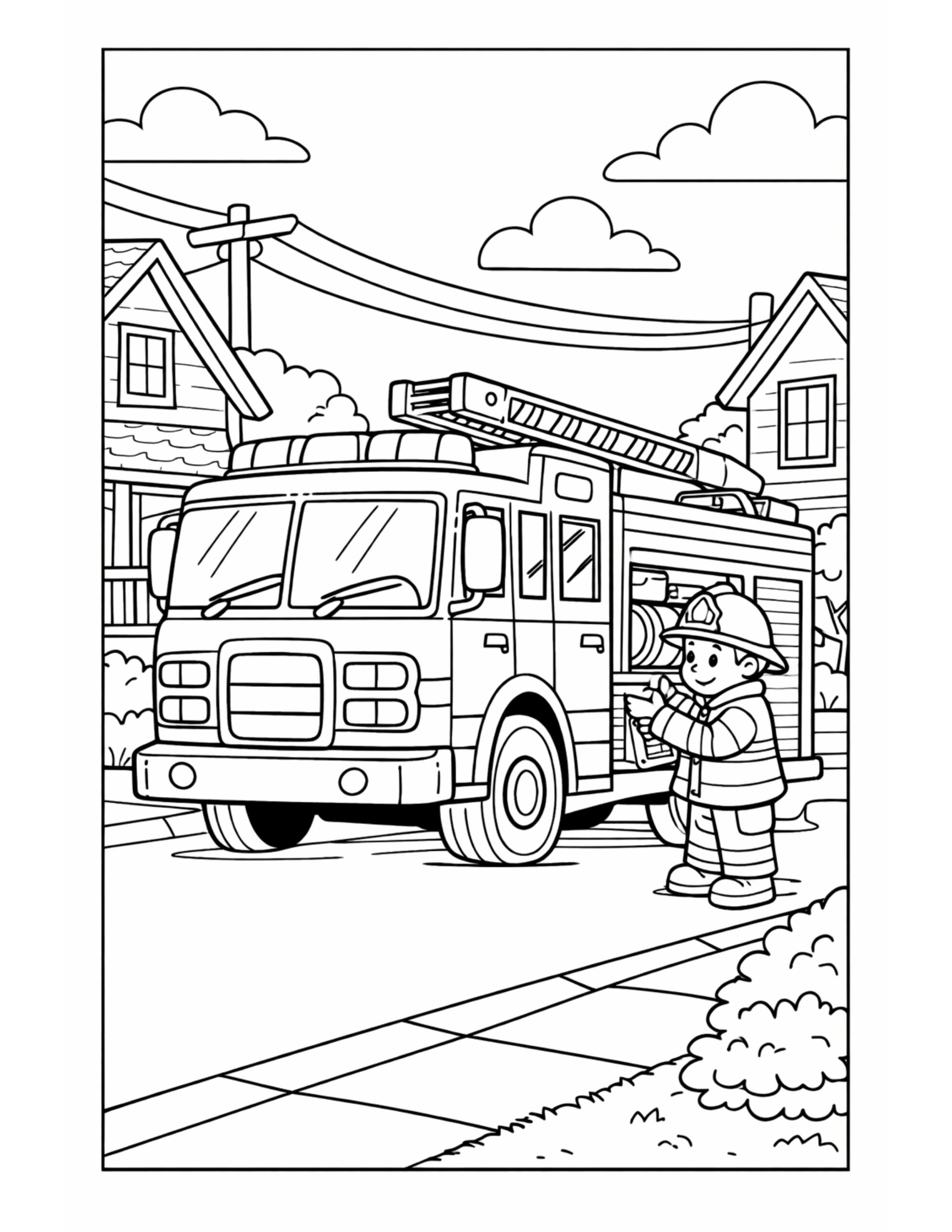 For this page, we entered the concept: “firefighter beside fire truck coloring page” on Colorin AI and generated a print ready coloring page in seconds.