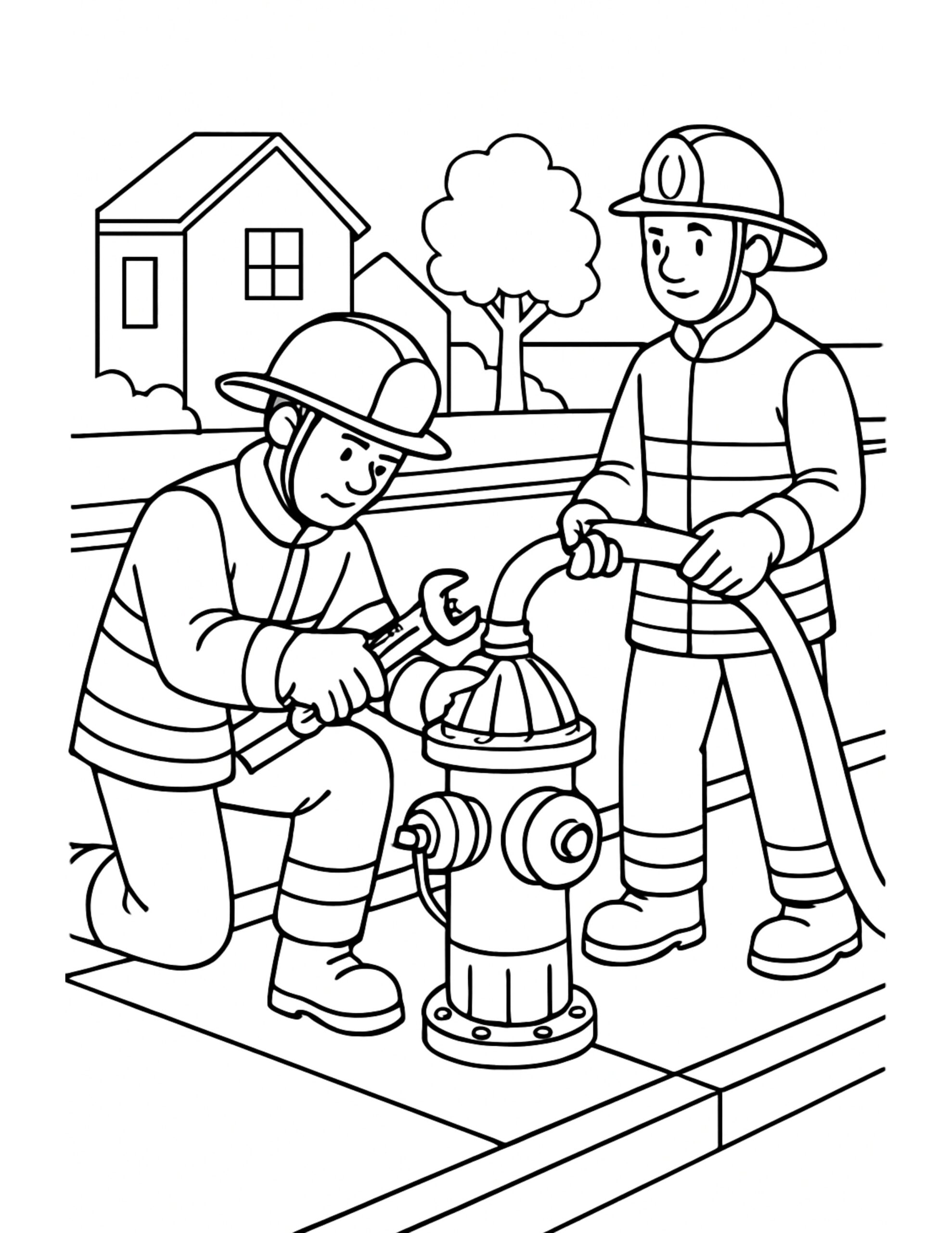 Firefighters Working at a Neighborhood Hydrant Coloring Page
