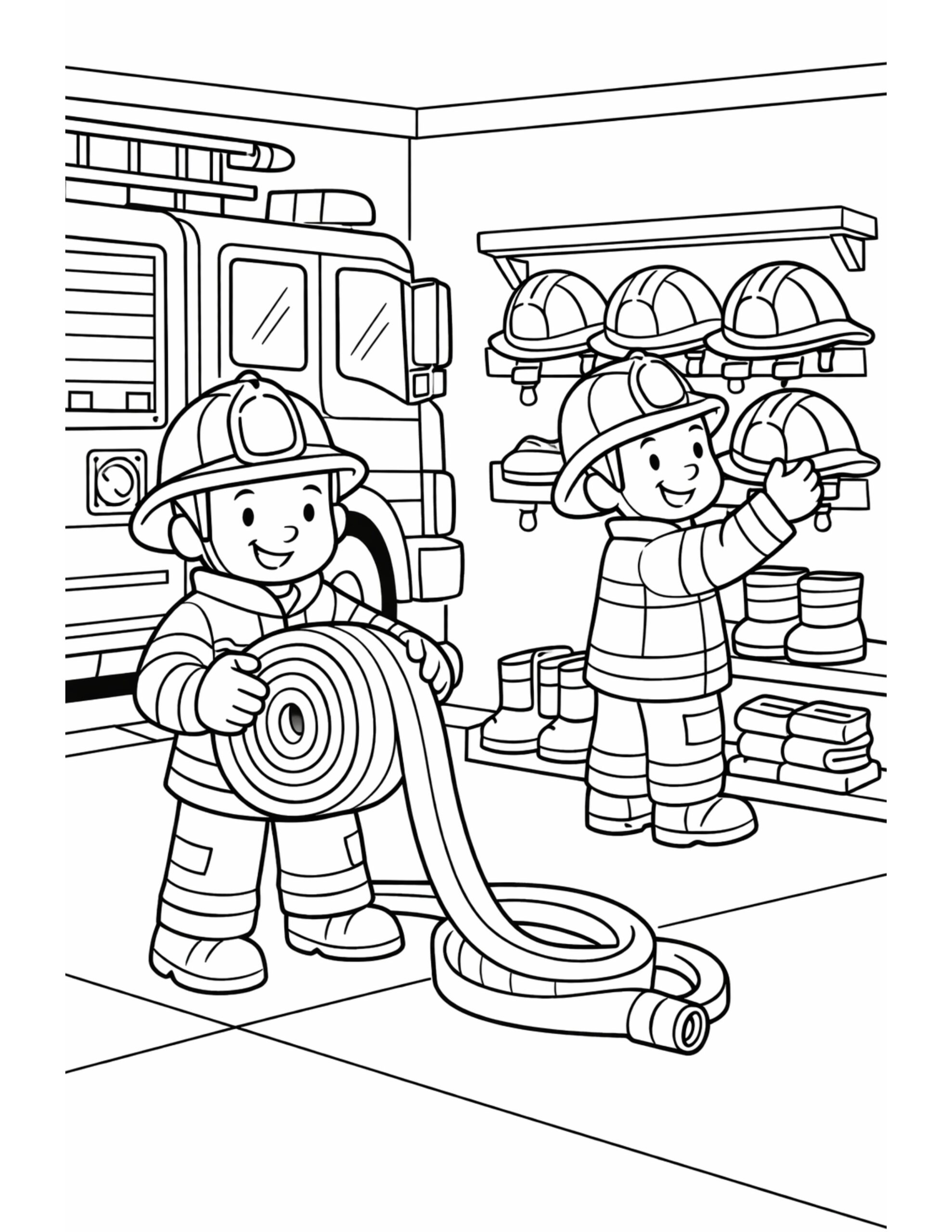 For this page, we entered the concept: “firefighters organizing gear in station coloring page” on Colorin AI and generated a print ready coloring page in seconds.